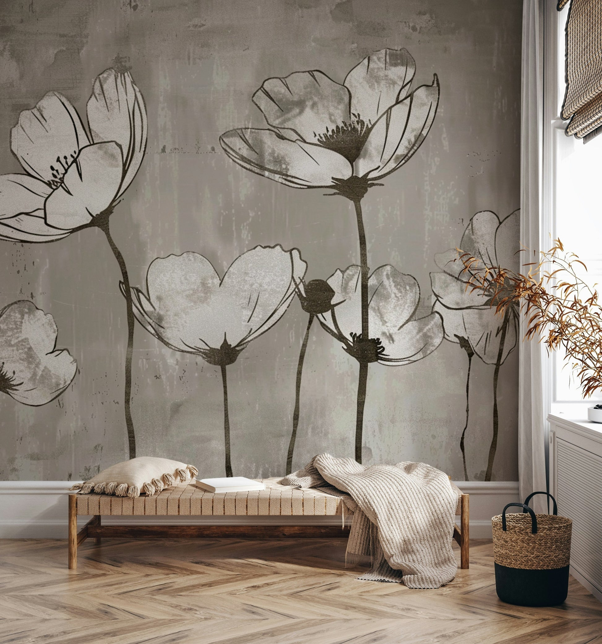 Elevate your home with this stunning industrial gray floral design—perfect for use as both a wall mural and wallpaper. The distressed floral silhouettes add a contemporary edge while maintaining a timeless elegance. Whether placed in a living room, bedroom, or office, its neutral tones effortlessly blend with modern, farmhouse, or urban aesthetics. Easy to install (peel-and-stick or traditional), this statement piece is among the top-searched floral wallcoverings on Etsy, ensuring your décor remains on-trend and unforgettable.