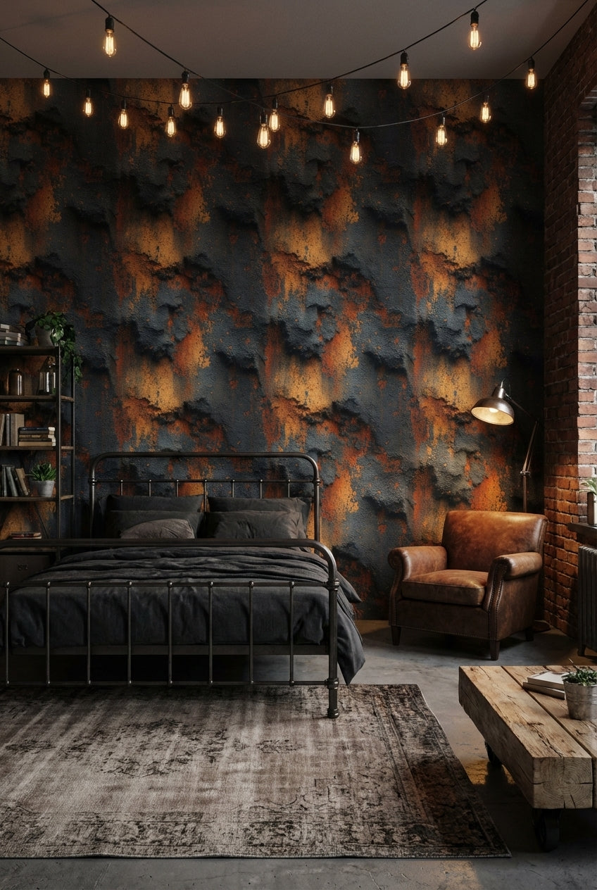 This industrial wallpaper has a bold texture with dark gray and rust orange hues. The abstract design and stone-like appearance work for modern decor.