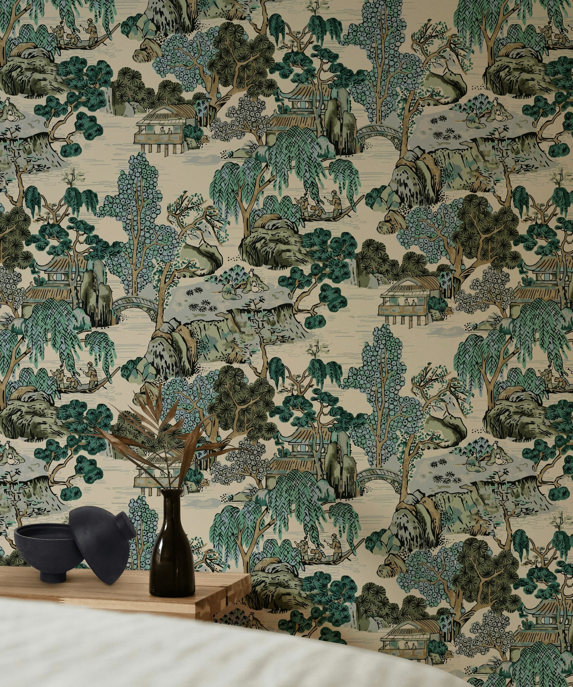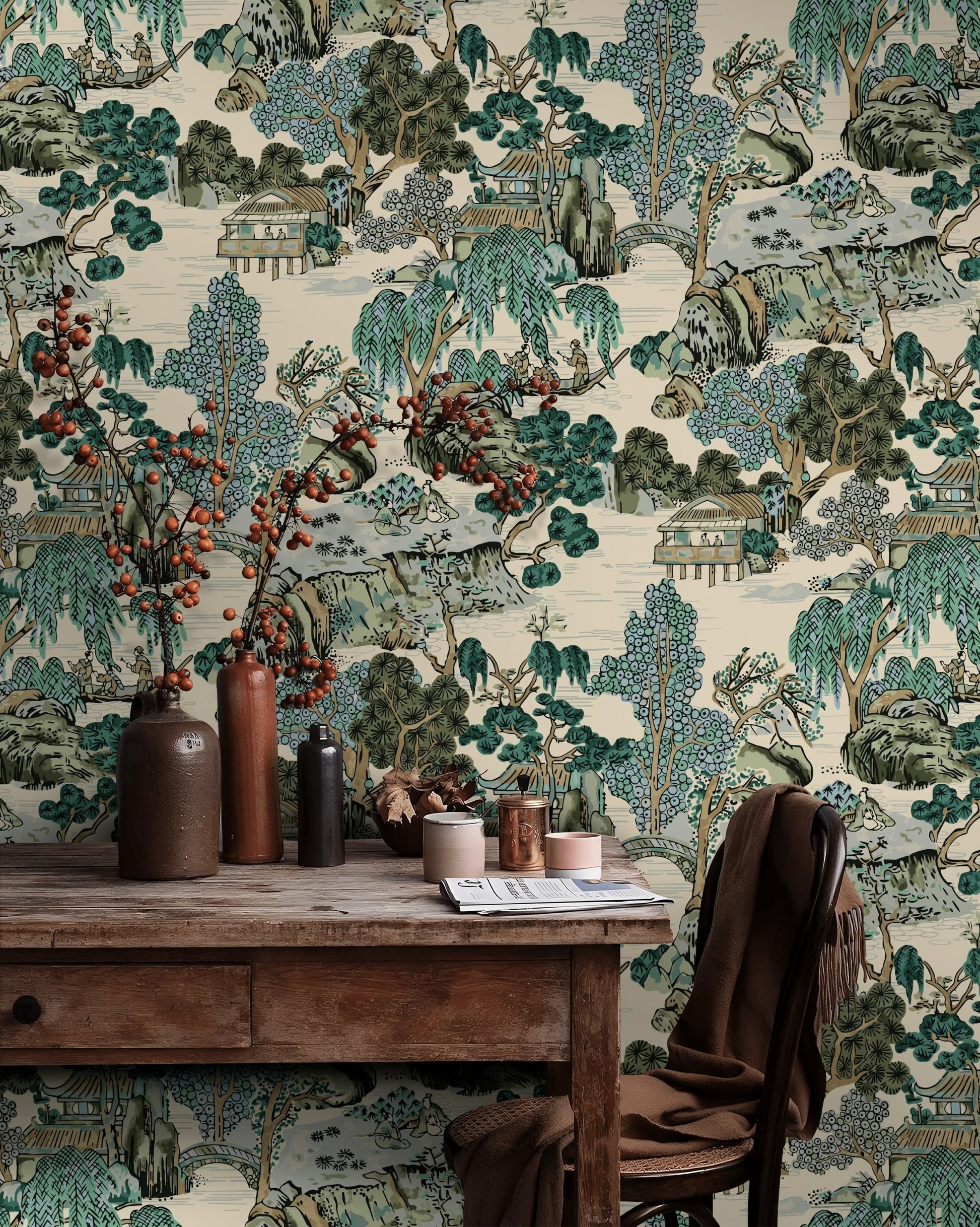 Transform your space with this enchanting Japanese garden wallpaper mural. Featuring a serene landscape with traditional wooden houses, weeping willows, and blooming trees in calming shades of teal and sage green. This timeless design captures the essence of traditional Asian art with meticulous detail and a peaceful composition.