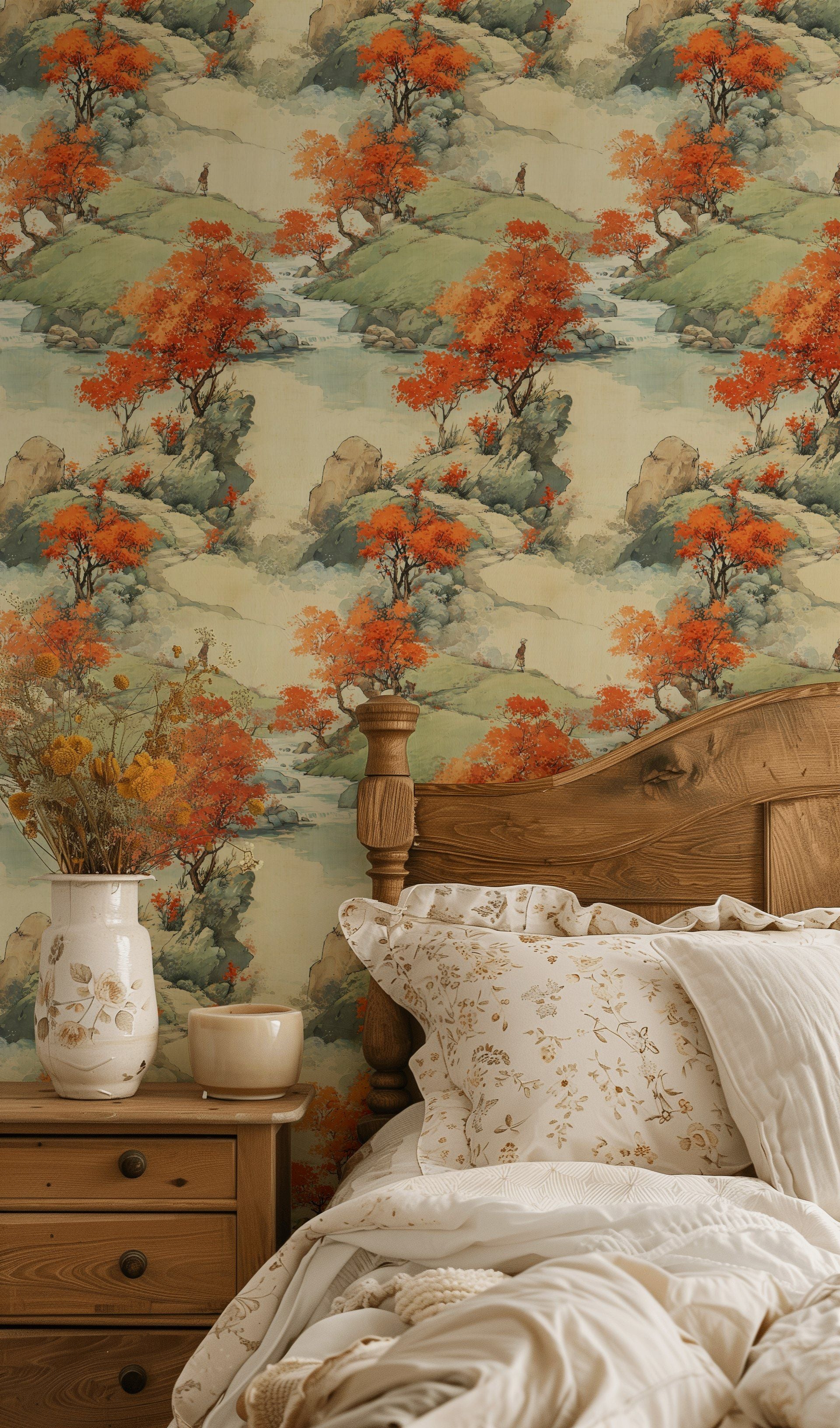 This Japanese landscape wallpaper is finished in hand-drawn detail, showing red maple trees along a flowing river with subtle watercolor wall effects. The scene features a tranquil path, landscape mural elements, and zen style influences. Soft green hills and stone accents blend with scenic wall tones, while asian decor details and double roll sizing offer flexibility. Red tree highlights and maple wallpaper themes add warmth to any adult living space.