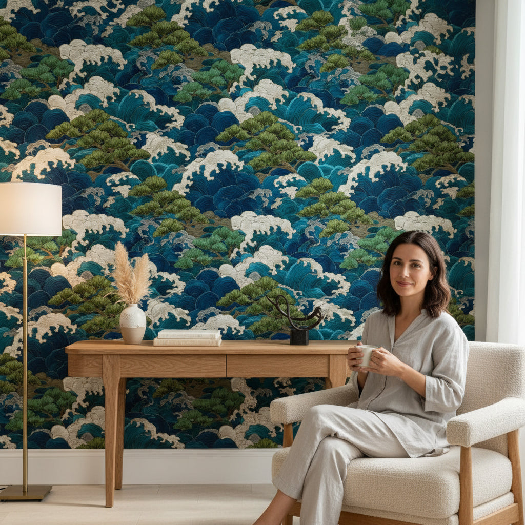 The large-scale wave pattern of the Deep Blue and Green Japanese Wave Wallpaper complements both traditional and eclectic decor styles by adding a bold, artistic flair that enhances the elegance of traditional settings while also providing a striking contrast in eclectic interiors.