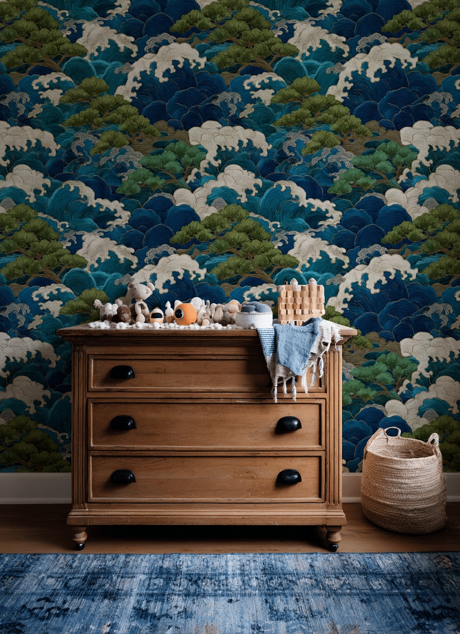 Is the Deep Blue and Green Japanese Wave Wallpaper safe for children's rooms?