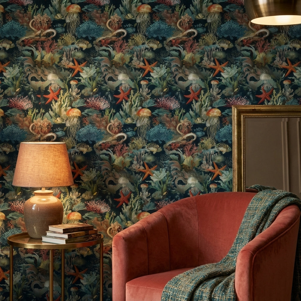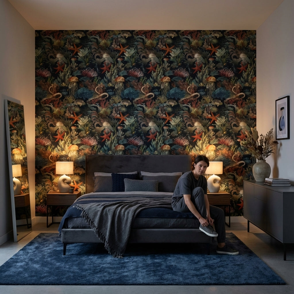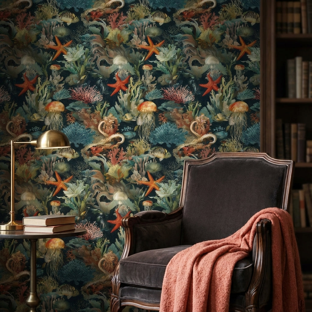 This modern wall mural shows an underwater scene with jellyfish, starfish, and coral. The tranquil design features blue, orange, and green tones, making it suitable for aquatic-themed decor.