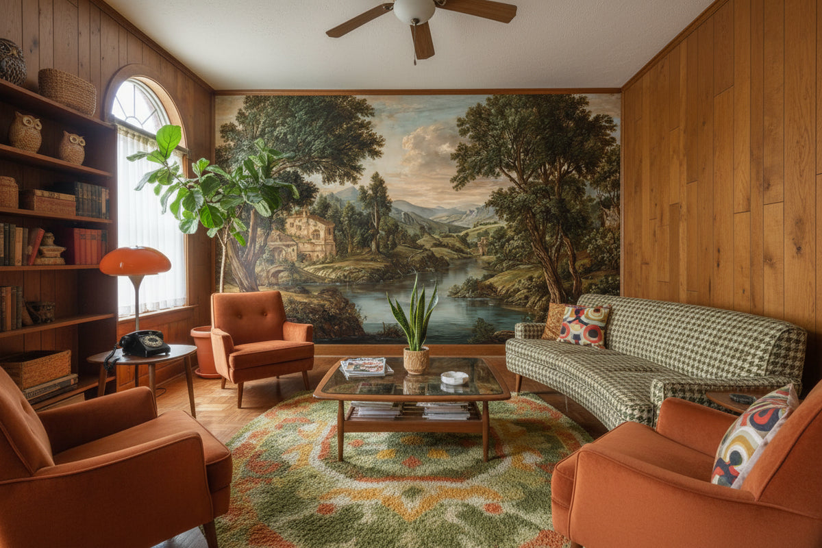 How does the retro style of the Rustic Brown Landscape River Wall Mural enhance a room's decor?