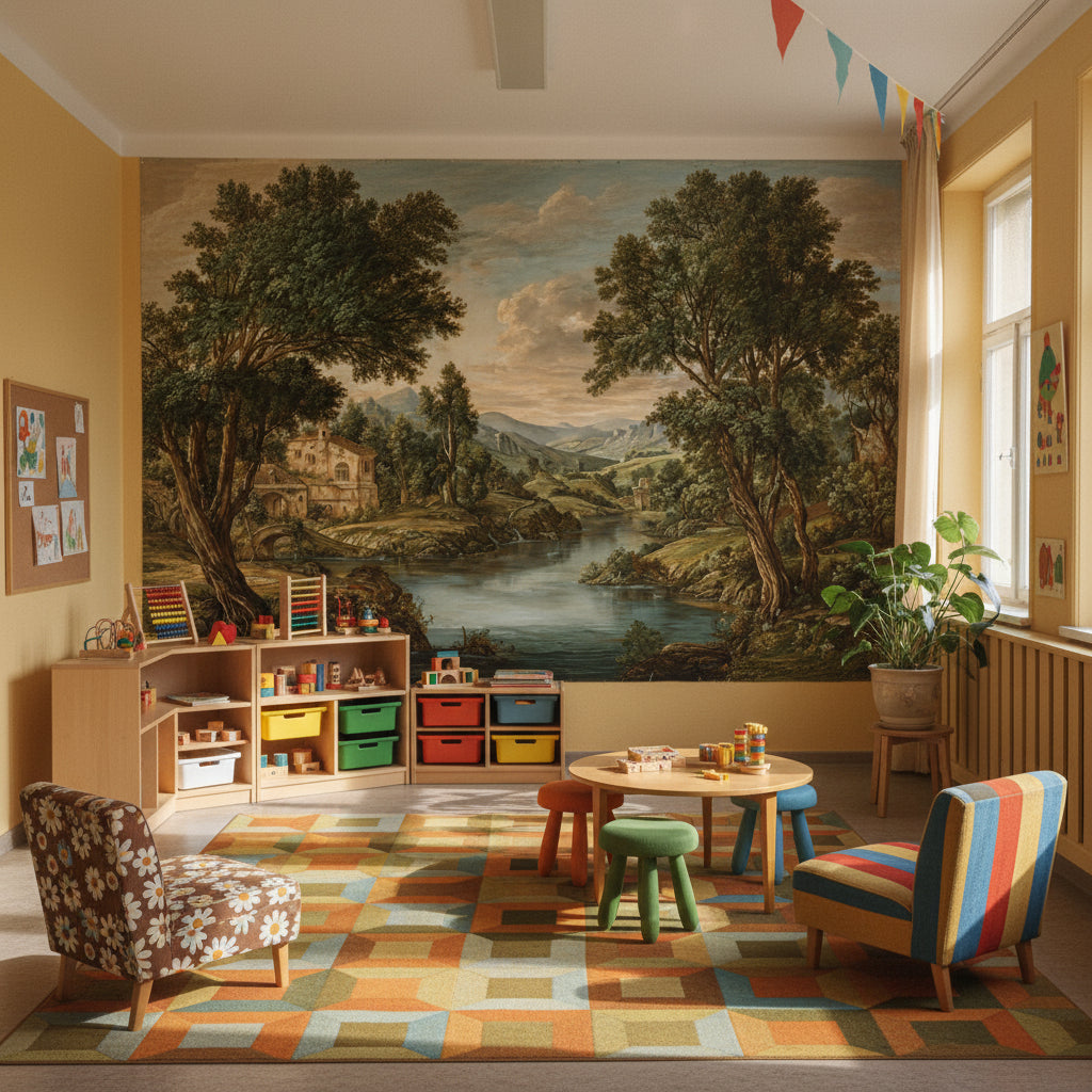The retro style of the Rustic Brown Landscape River Wall Mural adds a timeless charm that complements vintage and classic furnishings. The detailed landscape design brings depth and visual interest, enhancing the overall aesthetic of any room.