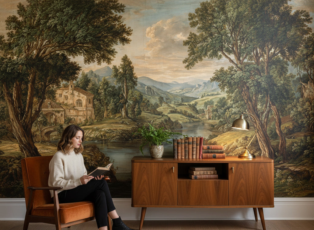 This classic wallpaper shows a serene landscape with trees, a river, and a historic structure set against rolling hills. The green, brown, and beige tones add to its vintage charm, making it suitable for traditional decor.