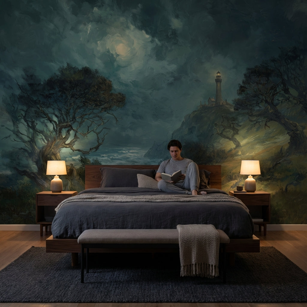 This digital artwork shows a serene scene with a lighthouse, coastal trees, and a moody night sky. The blue and green tones combined with the vintage style make it suitable for a traditional setting.