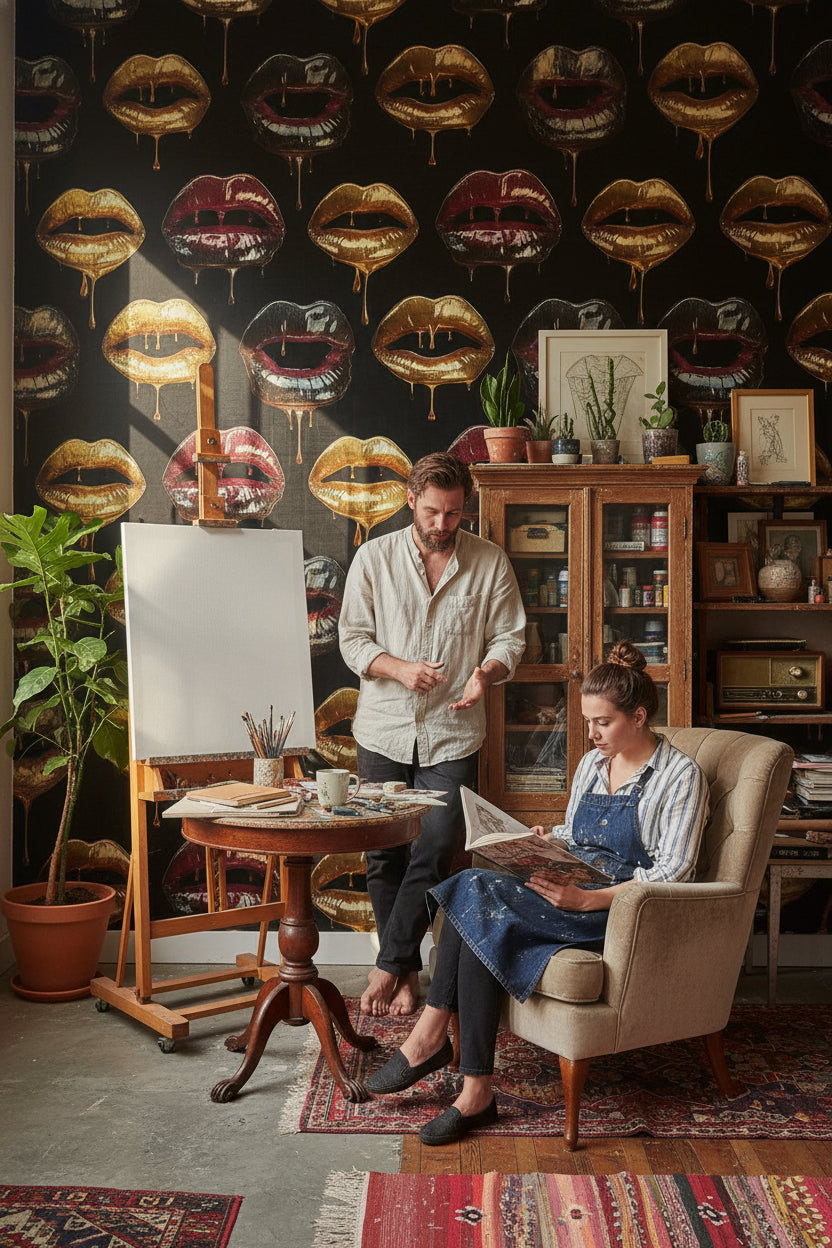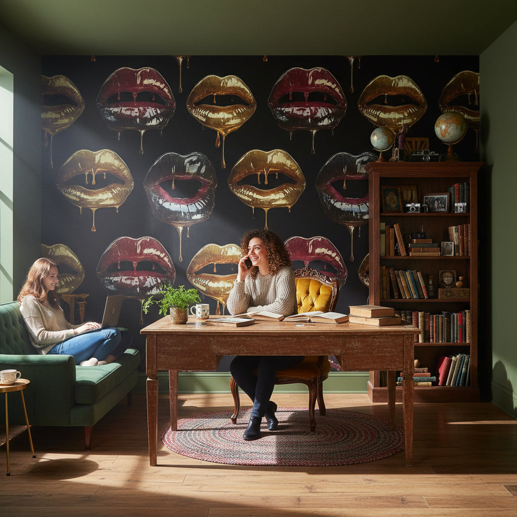 This modern wallpaper shows glossy lips with a luxurious gold dripping effect. The bold design in striking red and black tones adds a contemporary touch to any space.