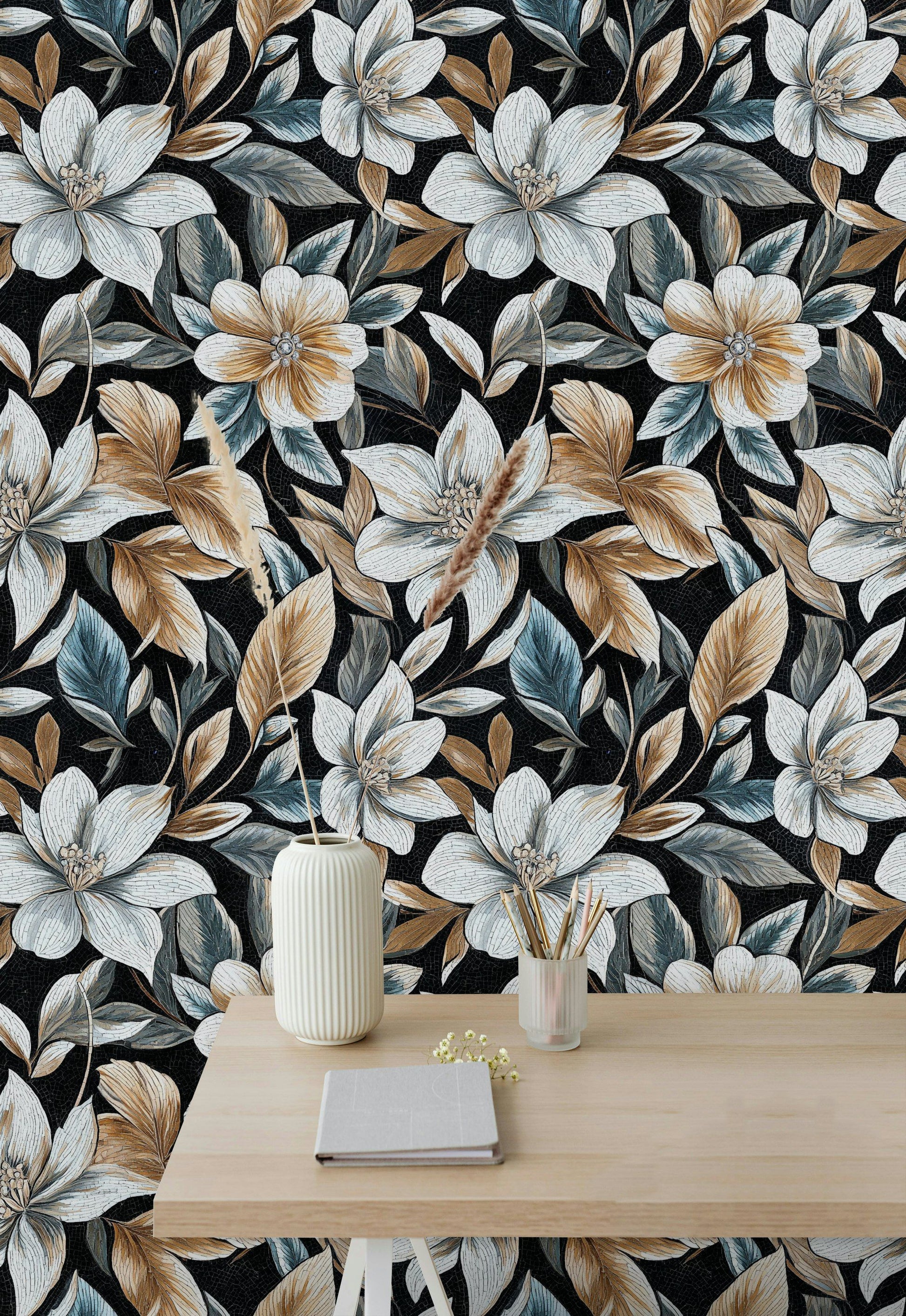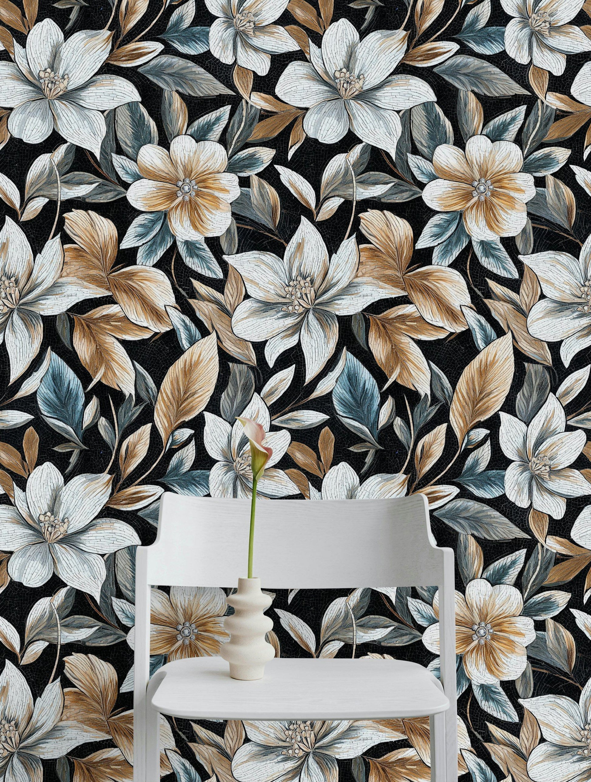 Transform your space with this luxurious mosaic floral wallpaper, featuring intricately detailed gold and blue leaves against a striking black background. The design exudes elegance and sophistication, making it perfect for creating a statement wall in your living room, bedroom, or dining area. The peel and stick application makes it easy to install and remove, allowing you to effortlessly elevate your home decor. The harmonious blend of colors and the mosaic texture give this wallpaper a timeless appeal, ideal for both modern and traditional interiors.