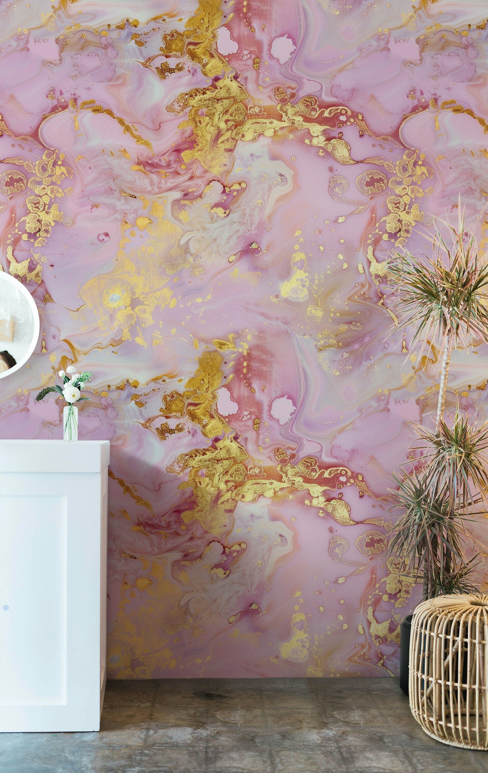 Elevate your interior design with this luxurious pink and gold marble wallpaper. Featuring an elegant abstract design with swirls of pink and accents of shimmering gold, this wall mural adds a touch of opulence to any room. Perfect for creating a feature wall in your living room, bedroom, or office, this wallpaper combines modern artistry with timeless elegance. Crafted from high-quality materials, it ensures durability and easy application. Transform your space with this stunning decorative piece that embodies sophistication and style.