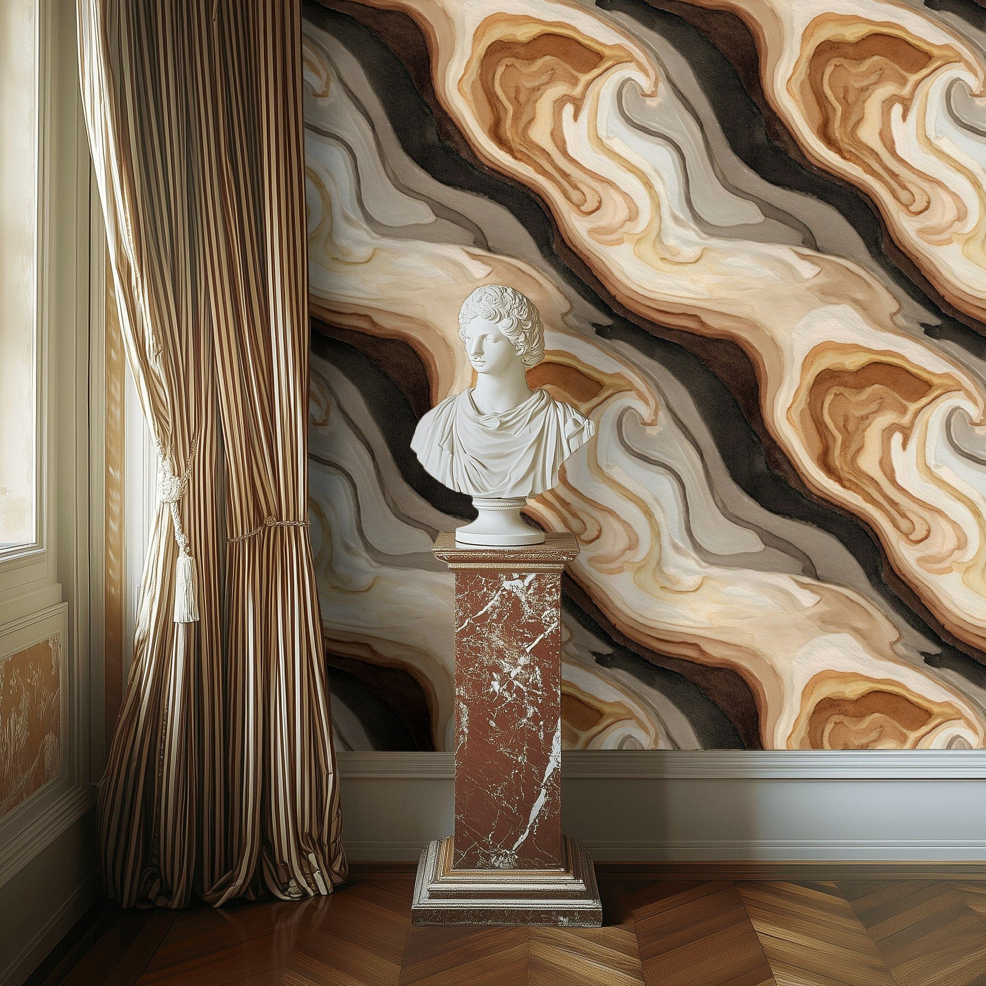 This design features flowing marble swirls in layers of brown, beige, tan, and cream with natural stone-like movement. The organic texture creates depth and warmth, making it striking for accent walls or larger spaces.