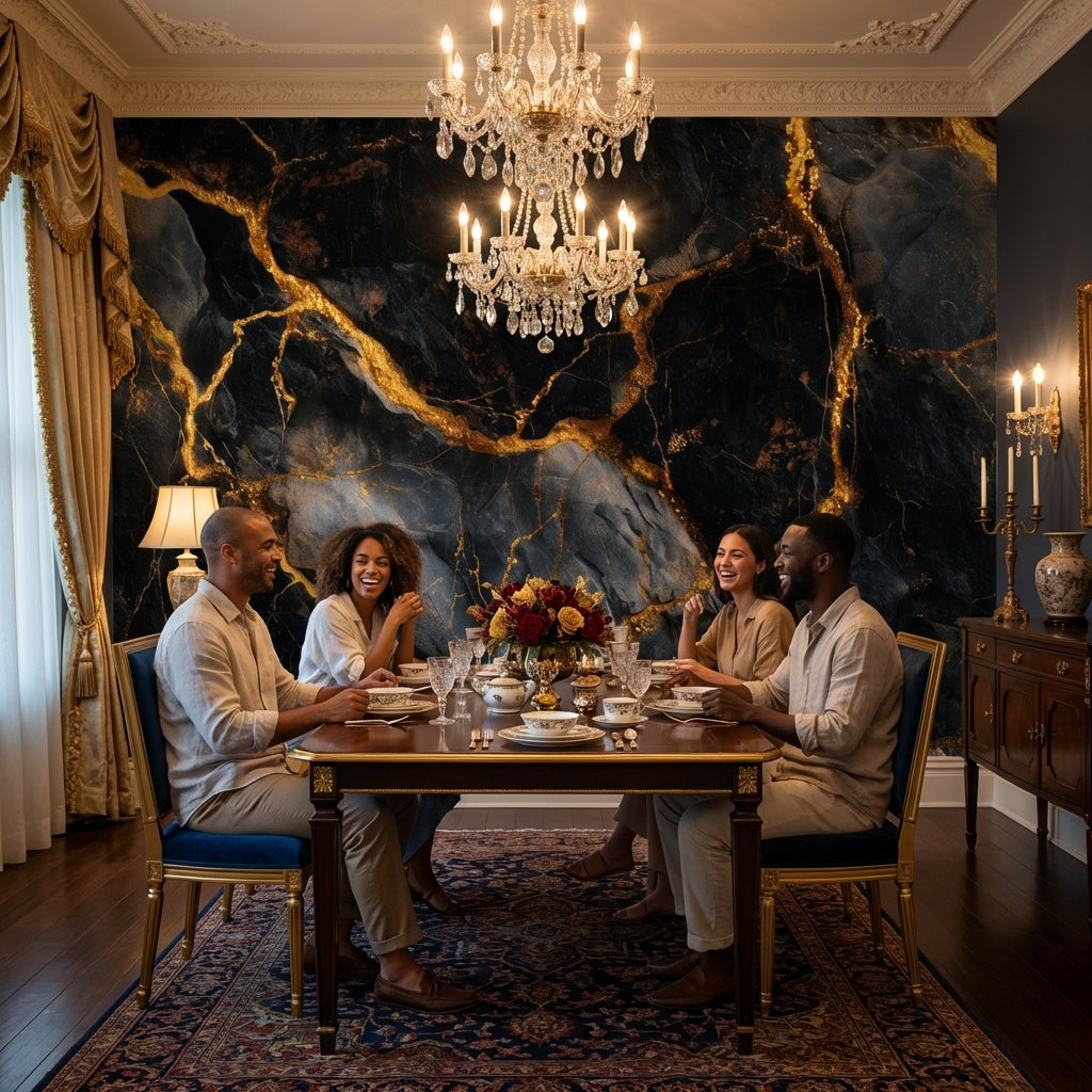 This elegant wallpaper has a marble texture with striking black and gold veins. The sophisticated design includes a modern style that enhances any luxury decor.