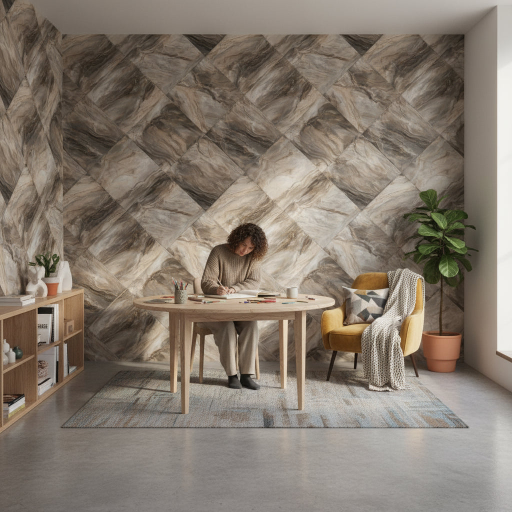 This modern wallpaper has a marble texture with geometric patterns in brown, beige, and gray tones. The elegant design includes a contemporary style that works beautifully as minimalist decor.