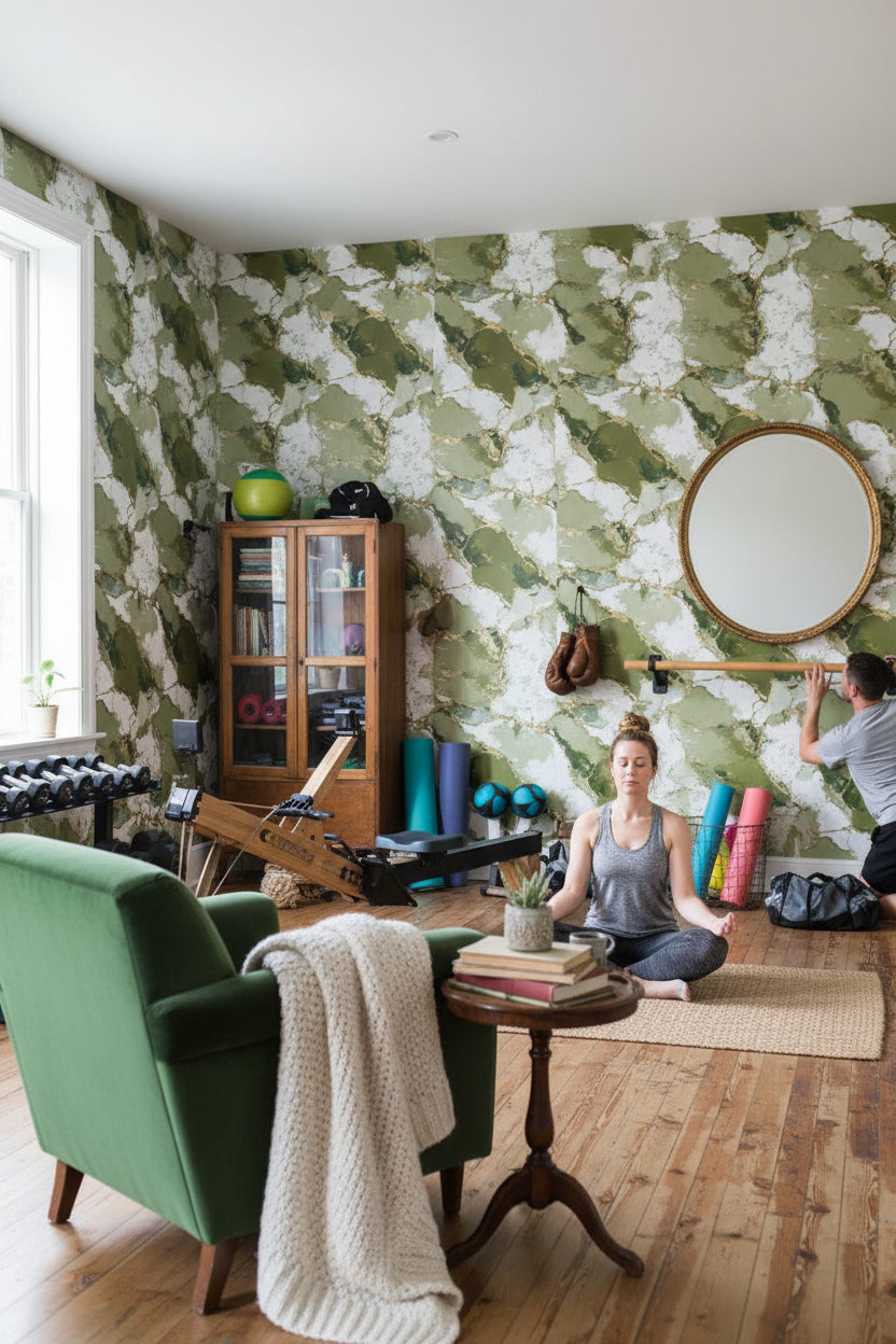 This modern wallpaper shows green and white marble with elegant gold veins. The abstract design and luxurious style work beautifully as a statement wall.