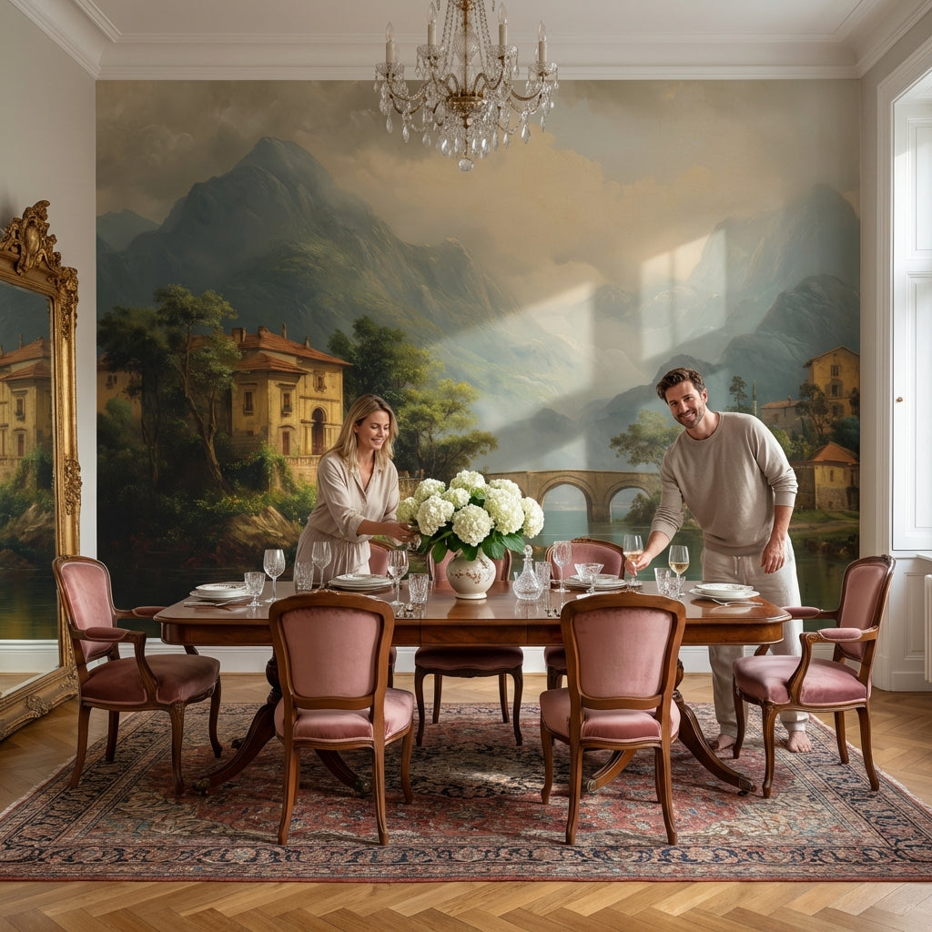 This classic landscape shows serene mountains, a flowing river, and a bridge with Mediterranean influences. The design includes green, blue, and beige tones that work for traditional decor.