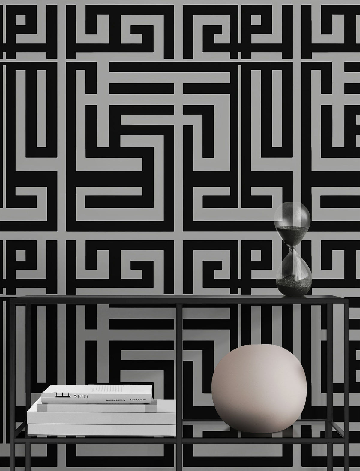 Interlocking geometric patterns in bold black create a captivating maze design against a smooth graphite gray background. The high contrast and crisp lines offer a contemporary aesthetic that's perfect for adding depth and interest to any wall space.
