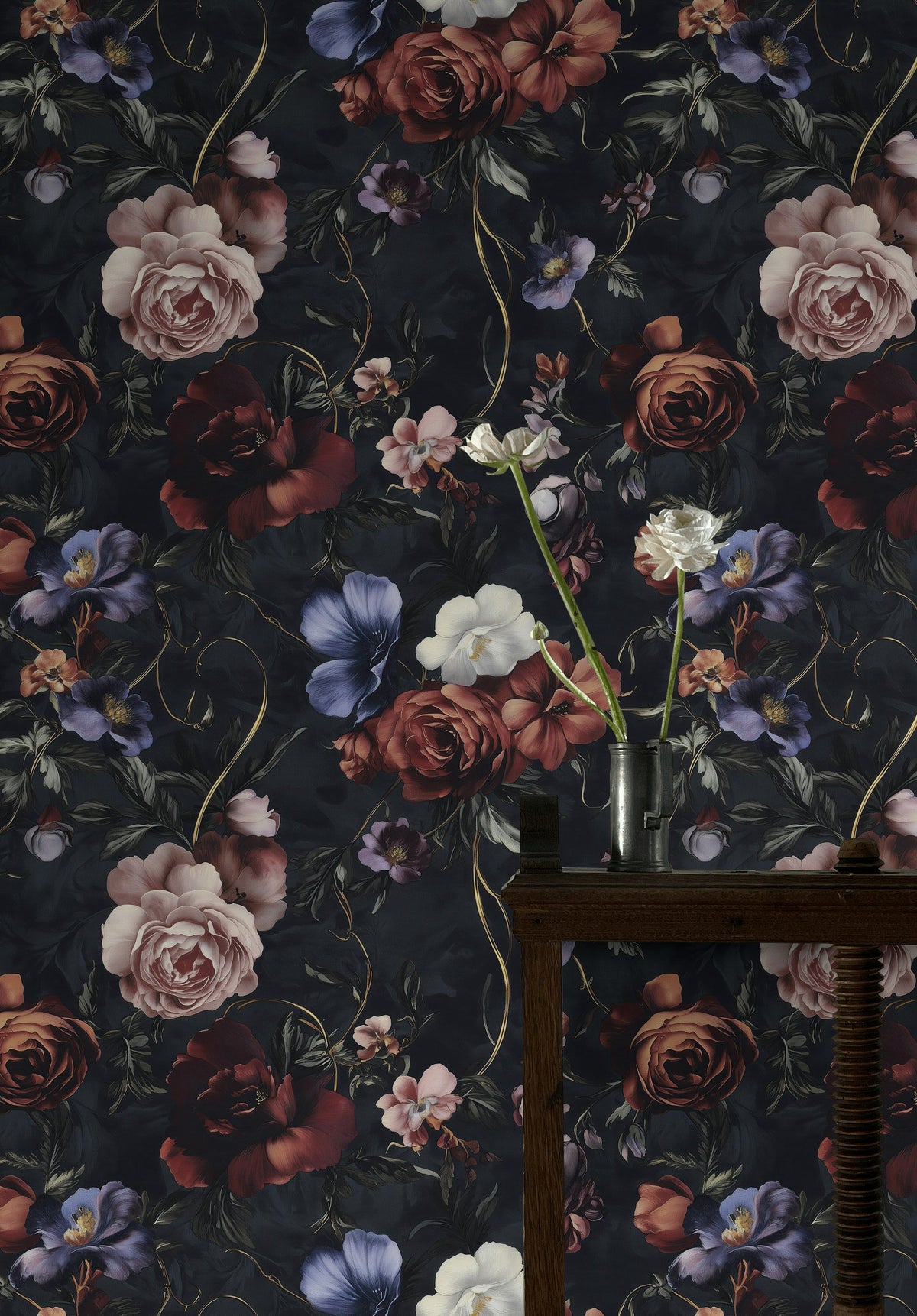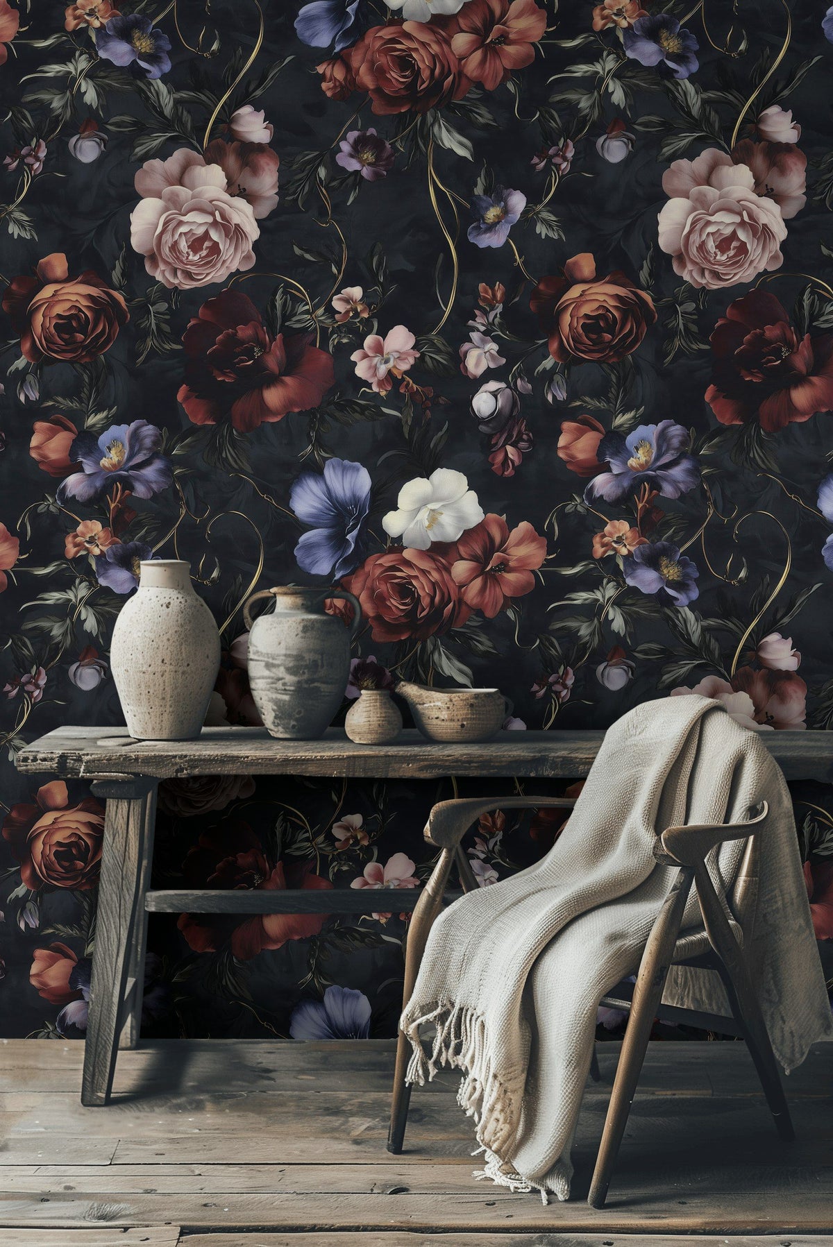 Elegant Dark Floral Roses Pattern Wallpaper - Complete Product Information