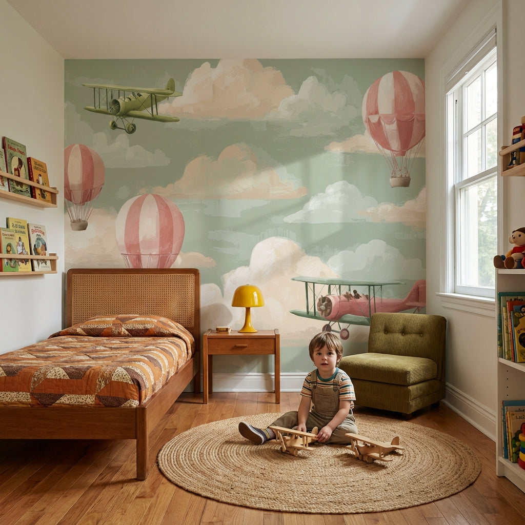 This playful vintage wallpaper features whimsical balloons and airplanes flying among soft clouds. The design uses muted green and pink hues, ideal for a nostalgic touch.