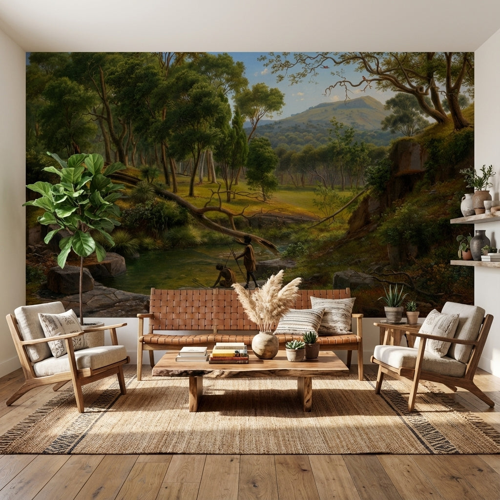 This mural shows a natural landscape with lush trees and a flowing stream under a clear blue sky. The green, brown, and blue tones reflect a serene outdoor scene perfect for creating a connection with nature indoors.