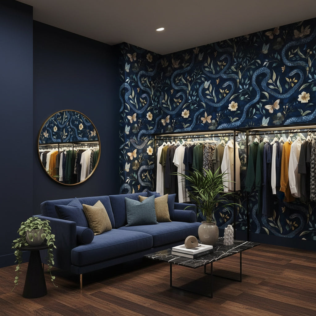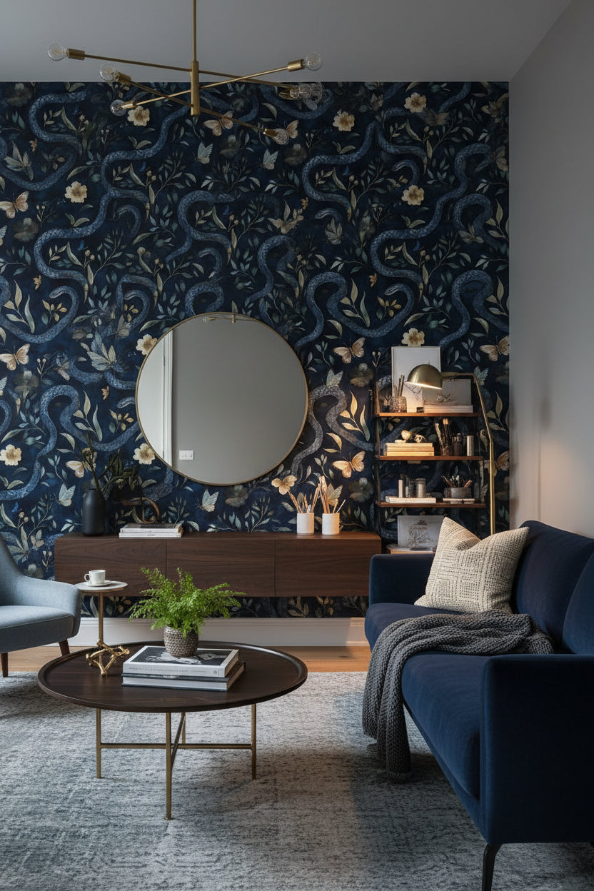 This elegant mural includes a nature-inspired design with snakes, butterflies, and floral elements. The rich navy and brown colors create a sophisticated pattern that works beautifully in a modern setting.