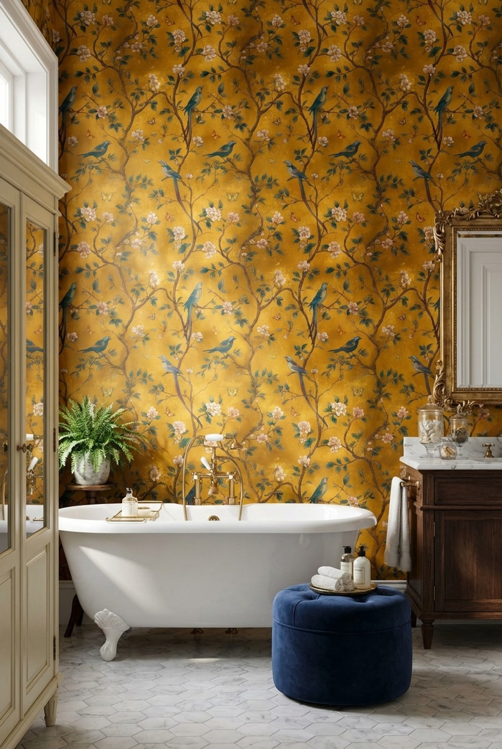 Is the Golden Yellow Chinoiserie Bird and Blossom Wallpaper suitable for a bedroom?