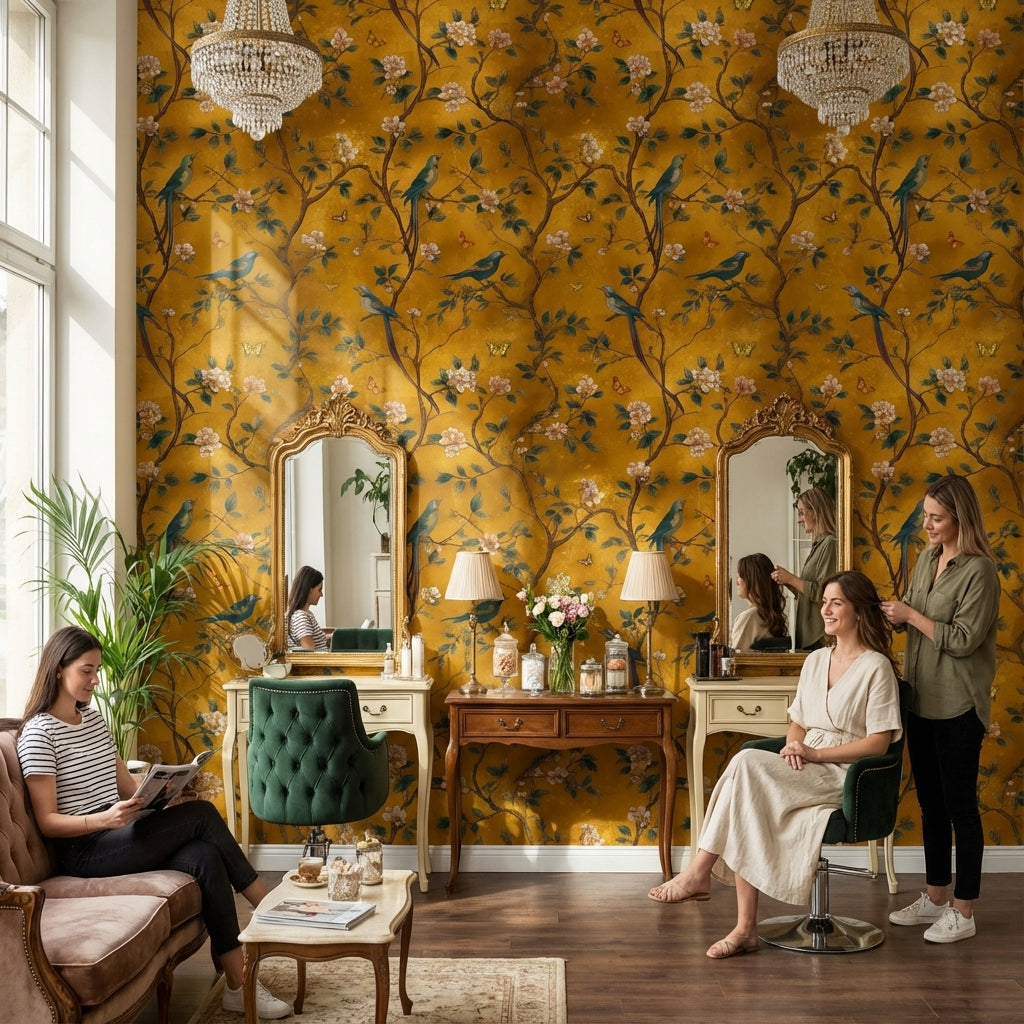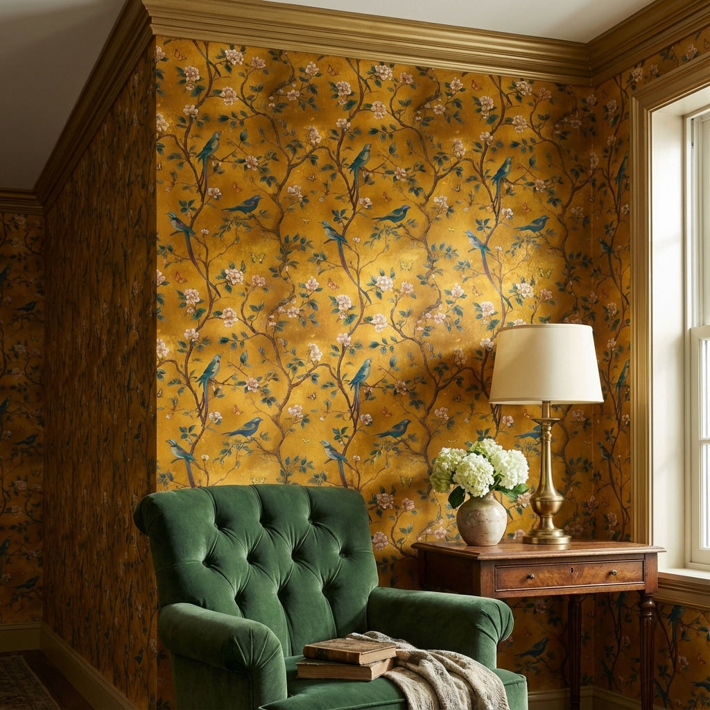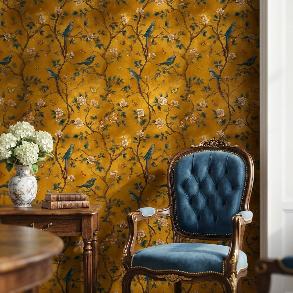 This wallpaper complements luxury and vintage styles beautifully, thanks to its elegant birds and delicate cherry blossom design. The rich golden yellow background adds a touch of opulence, making it ideal for creating sophisticated interiors.