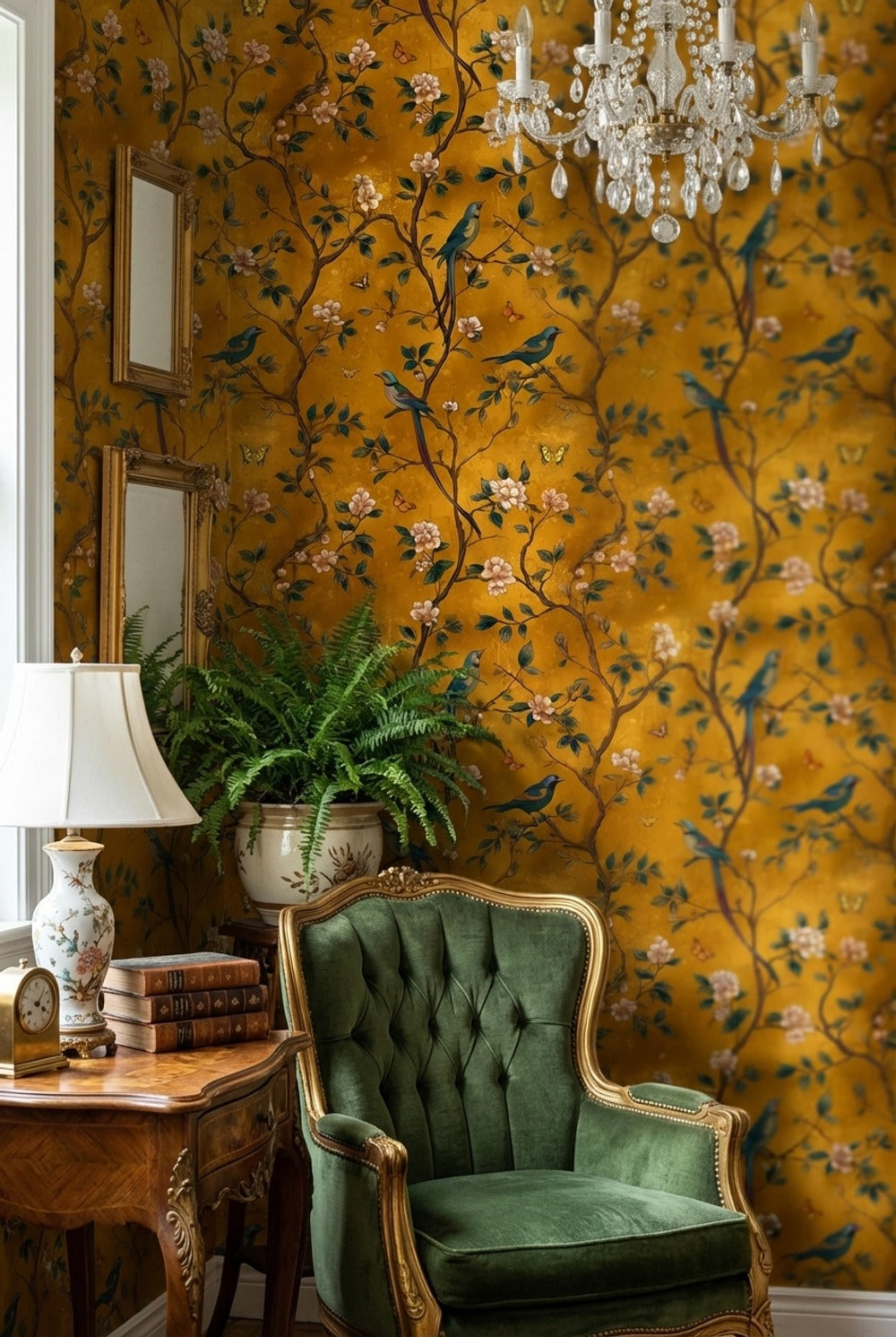 What style does the Golden Yellow Chinoiserie Bird and Blossom Wallpaper complement best?