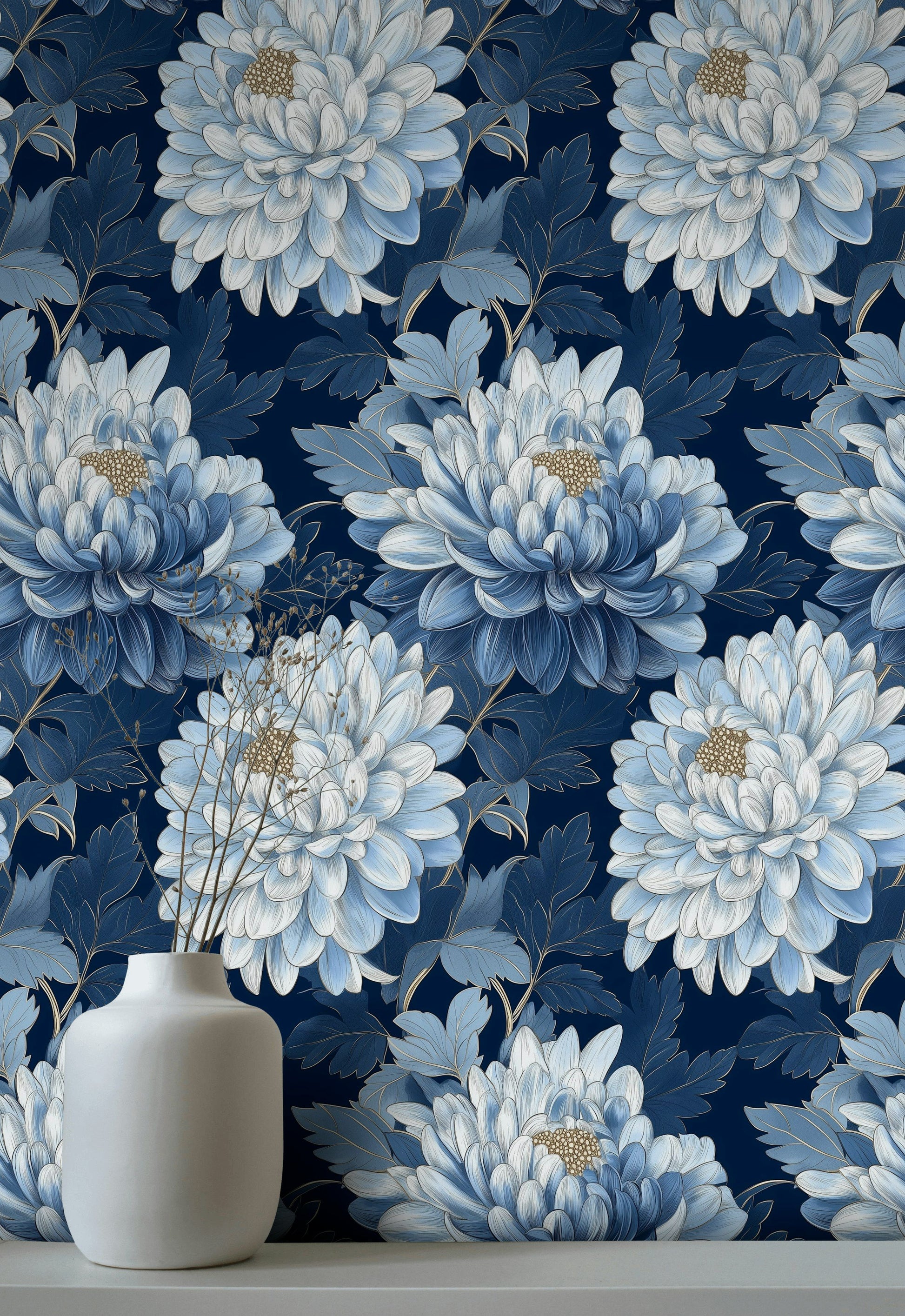 Elevate your interior with this striking navy chrysanthemum wallpaper wall mural, accented by delicate gold details. Crafted from premium, fade-resistant materials, it ensures long-lasting vibrancy and easy maintenance. Choose between peel-and-stick or traditional paste for a hassle-free installation that delivers a seamless, professional look. Perfect for bedrooms, living rooms, or statement walls, the bold floral design brings a sophisticated yet inviting ambiance to your home. Let these lavish blossoms transform your space into a refined retreat that exudes both style and elegance.