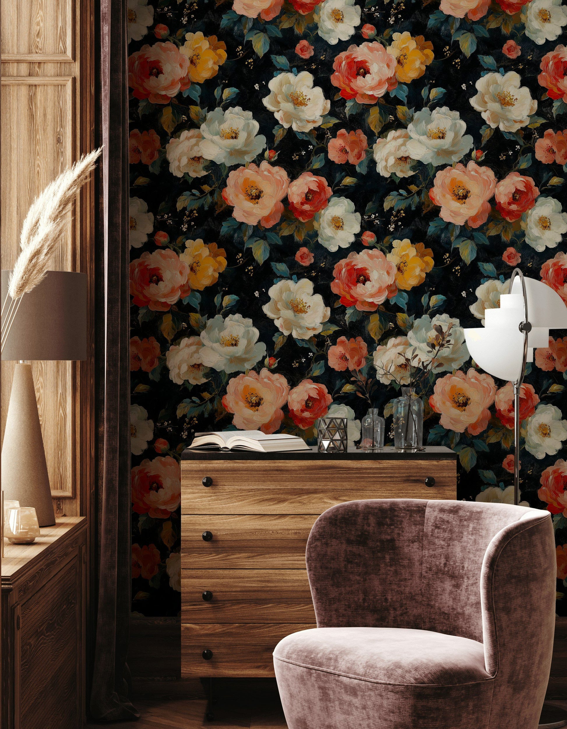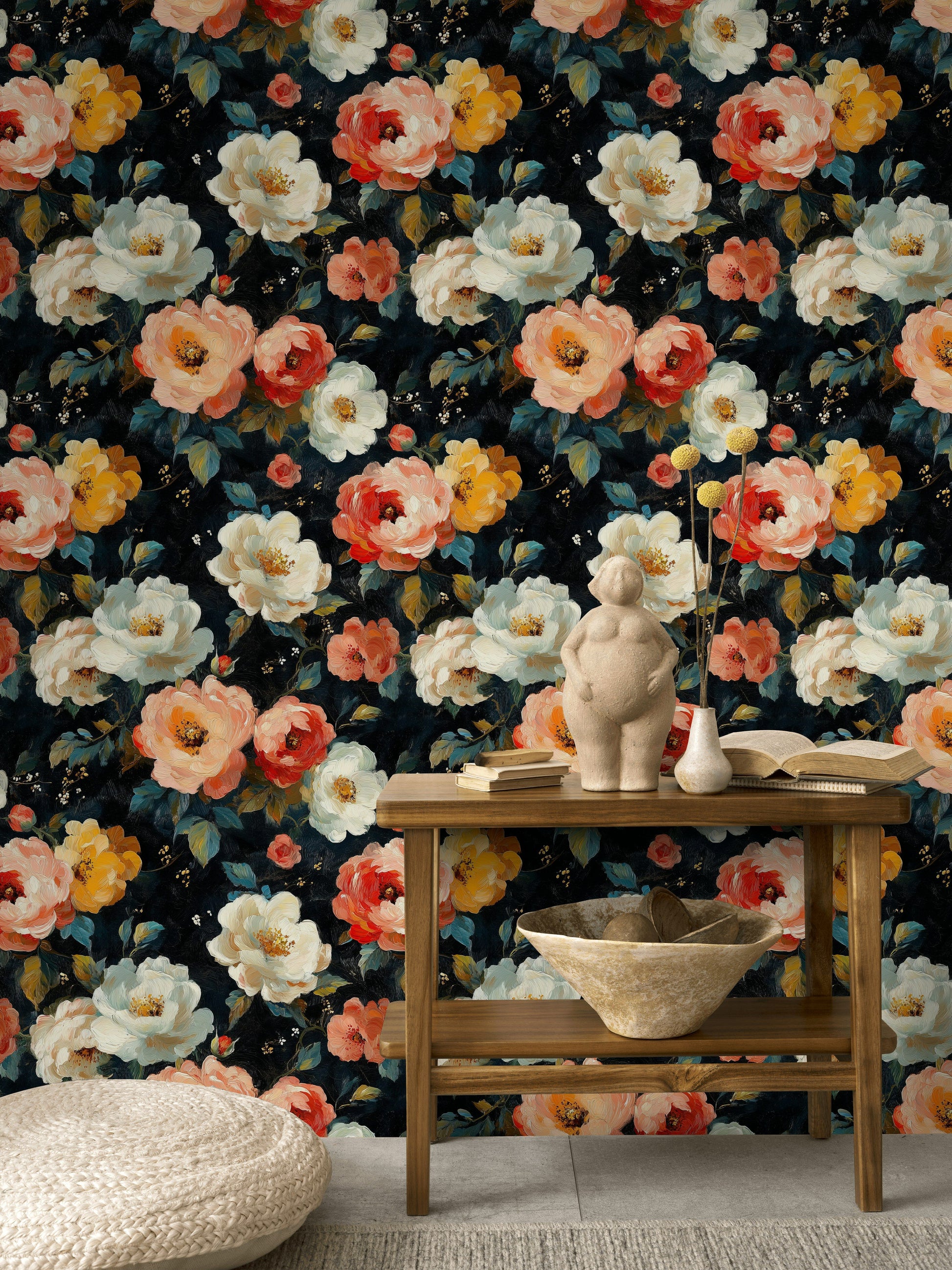 Transform your space with our stunning oil-painted floral wallpaper featuring vibrant coral, white, and golden yellow peonies against a rich navy background. This artistic wall mural showcases textured brushstrokes and dimensional blooms with teal-blue foliage for a dramatic yet elegant effect. Our premium peel and stick material ensures effortless installation and removal without damaging walls, making it perfect for accent walls, bedrooms, or creative spaces. Each panel delivers exceptional print quality that preserves the painterly details and depth of the original artwork, bringing gallery-worthy design into your home or business interior.