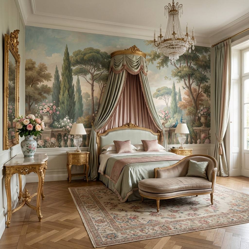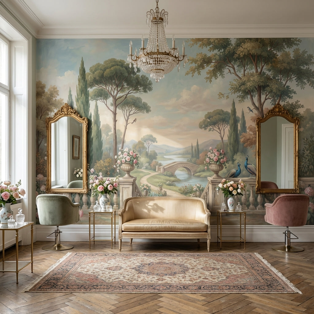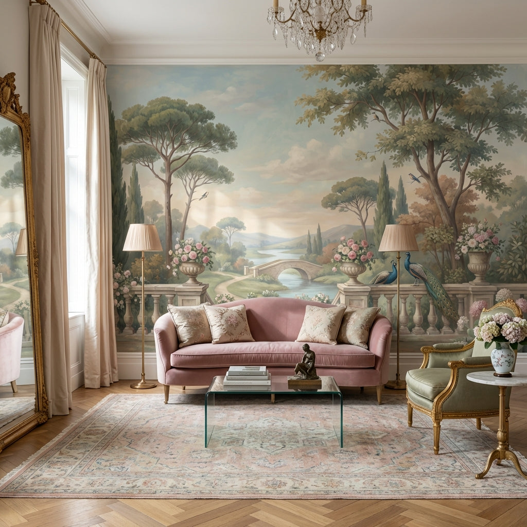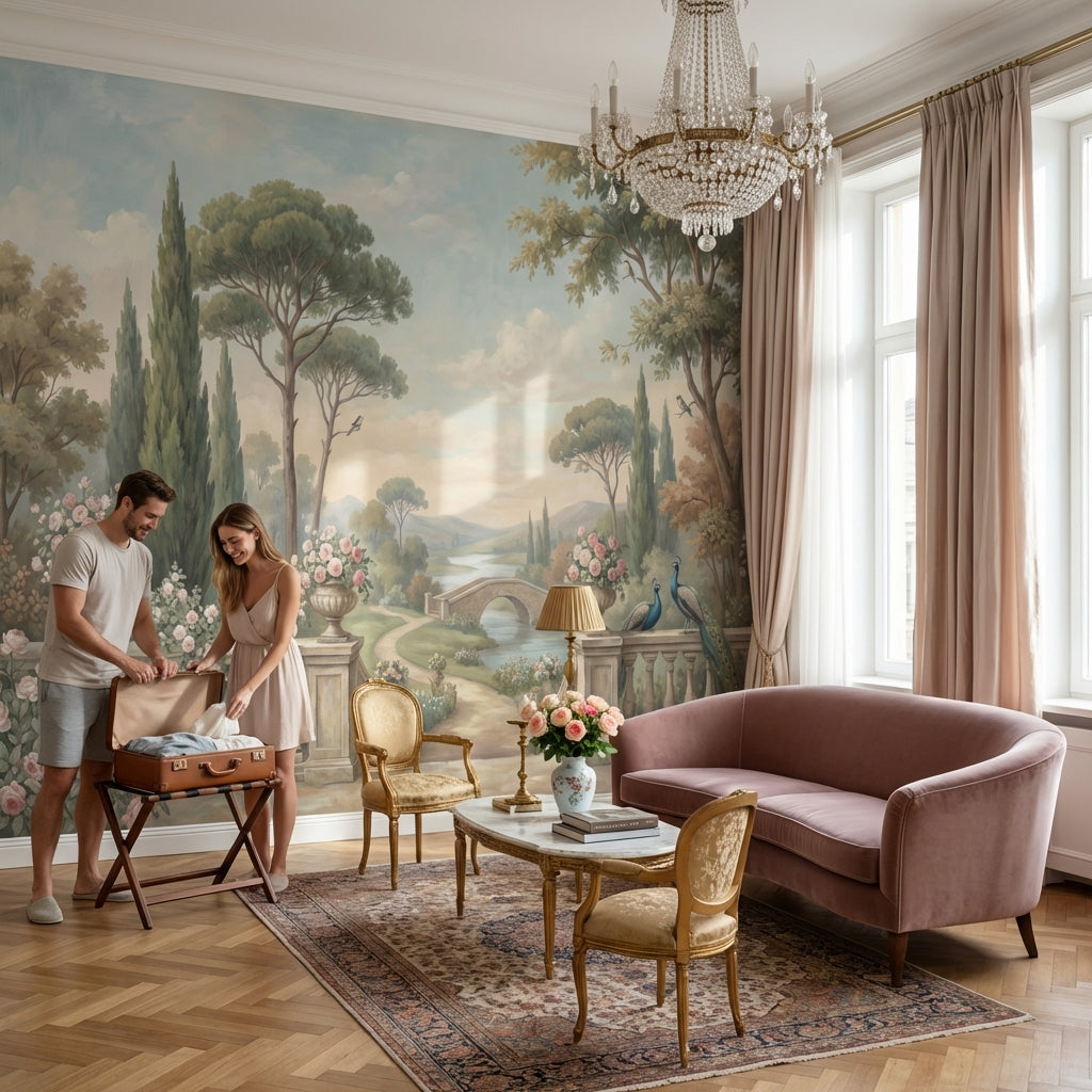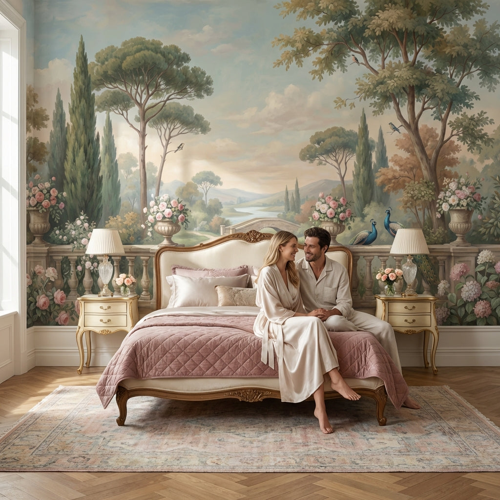 This classical wallpaper includes a serene garden scene with peacocks, roses, and a charming bridge. The design has lush greens, soft pinks, and classic blues, perfect for adding a vintage touch to any room.