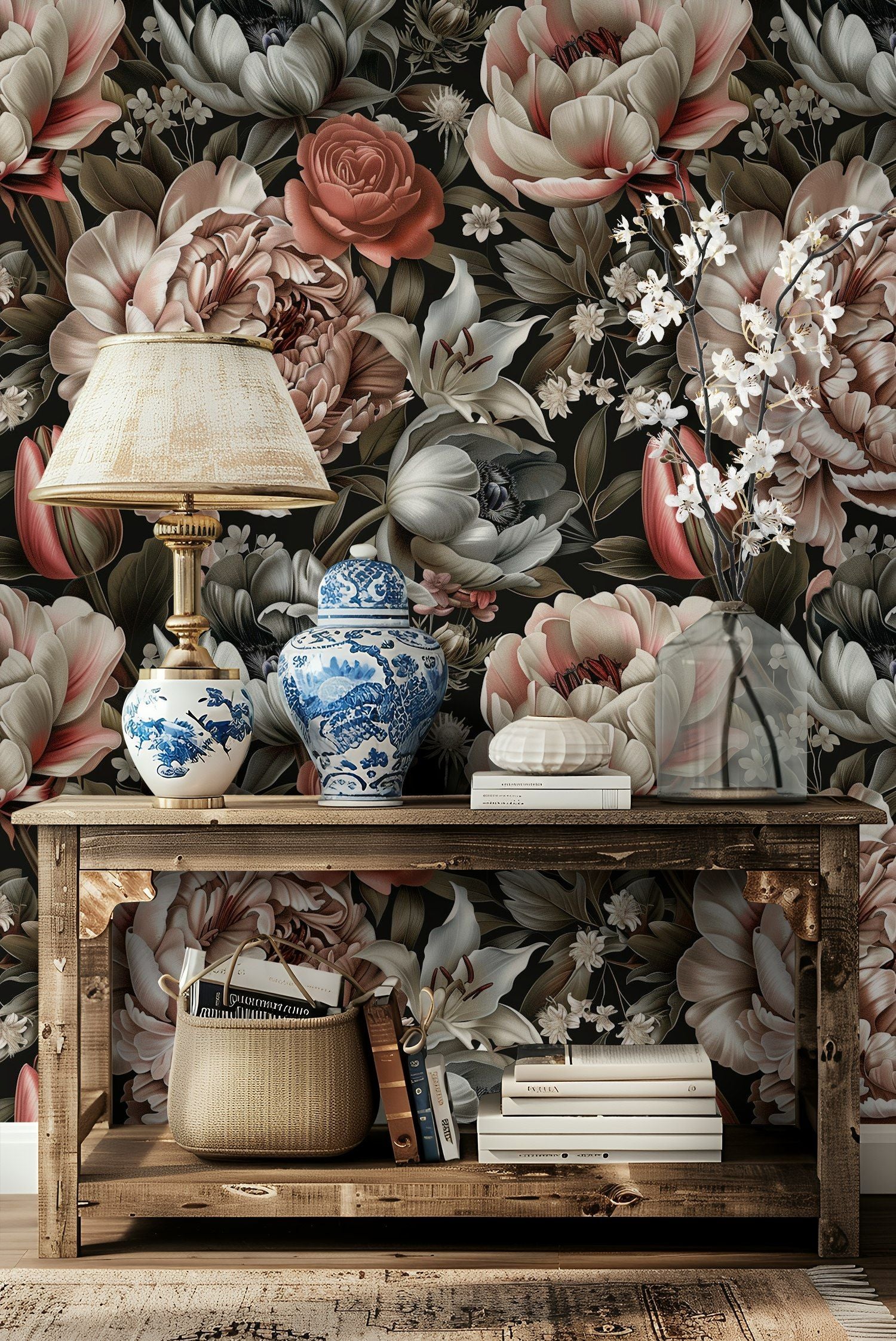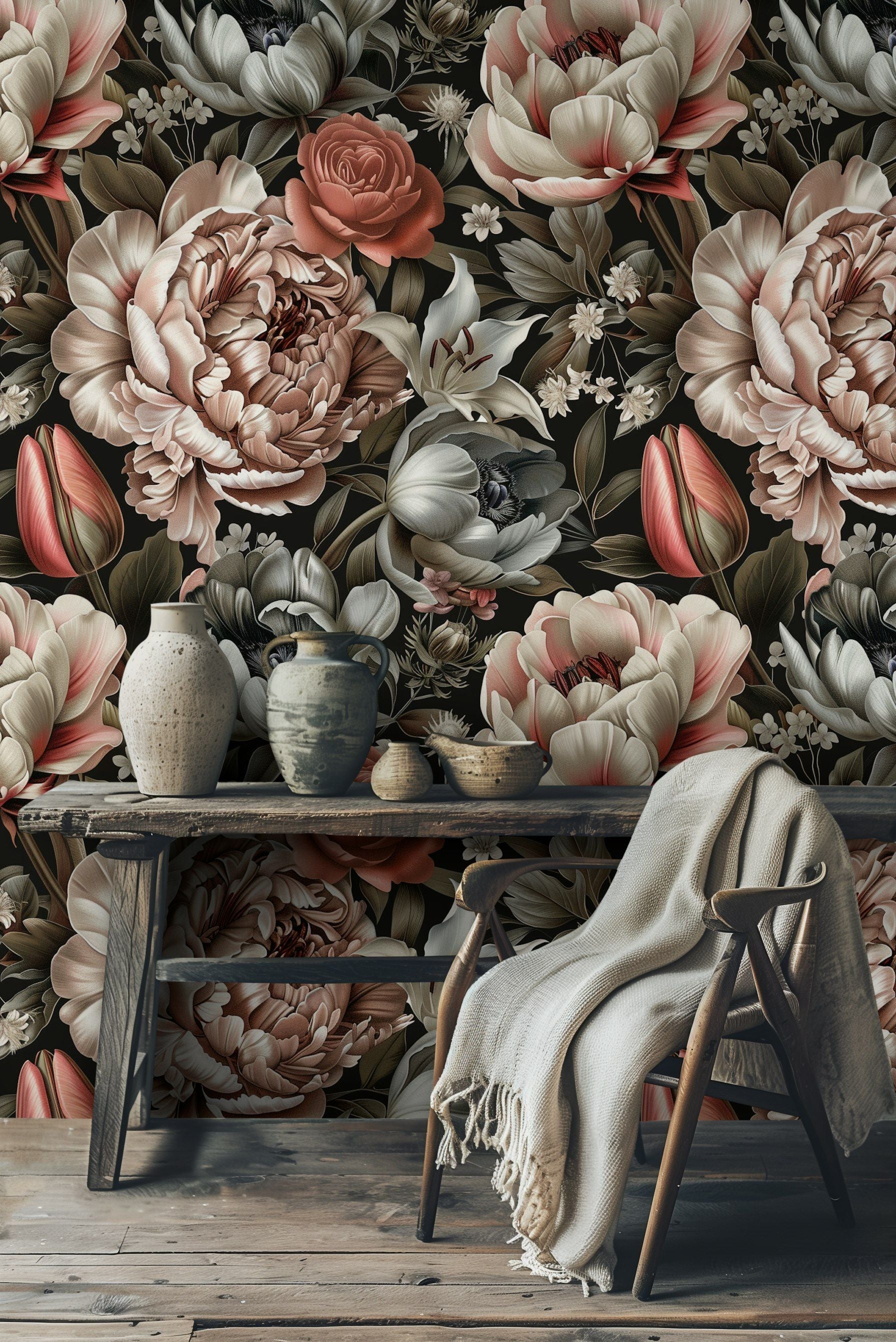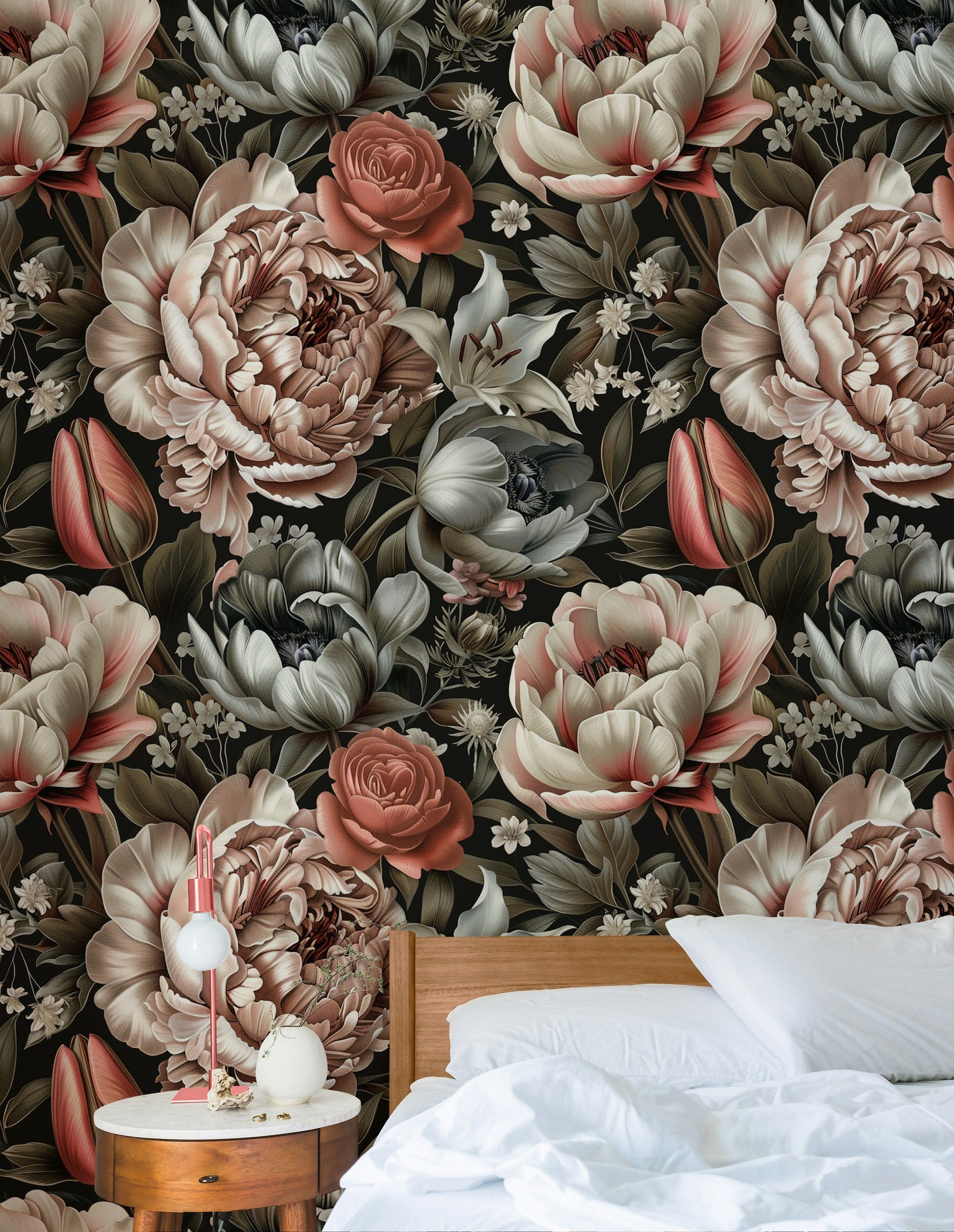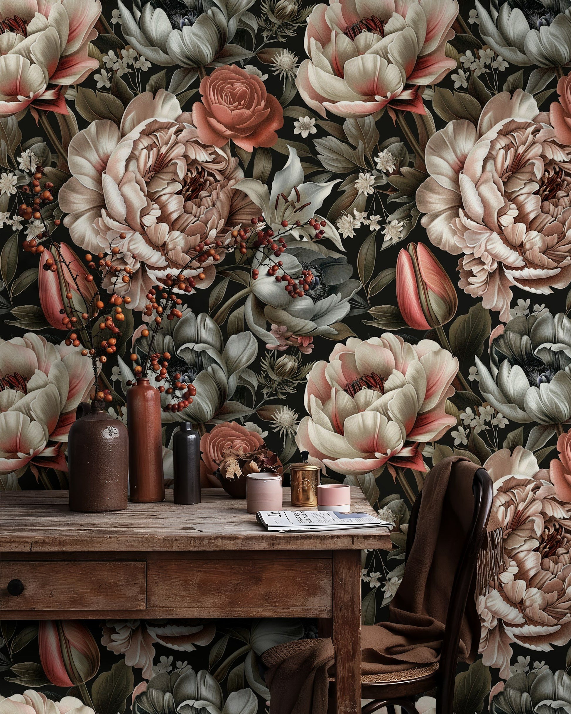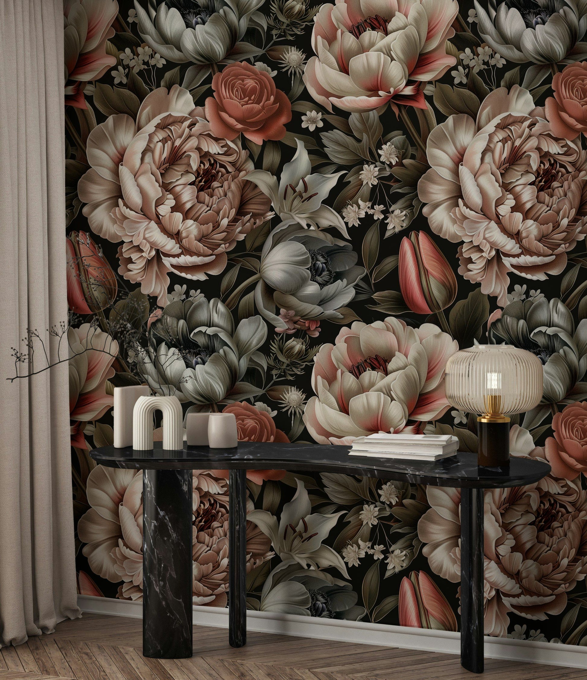 This stunning peony floral wallpaper showcases a beautiful array of soft pastel tones, featuring intricate blooms of peonies, roses, and lilies. Set against a dark background, the design brings out the delicate beauty of each flower, creating an elegant and sophisticated ambiance in any room. Ideal for those looking to add a touch of timeless elegance to their decor, this wall mural is perfect for living rooms, bedrooms, or dining areas. The detailed botanical pattern enhances the natural feel of the space, while the high-quality material ensures durability and easy application. Transform your home with this luxurious and captivating floral design.
