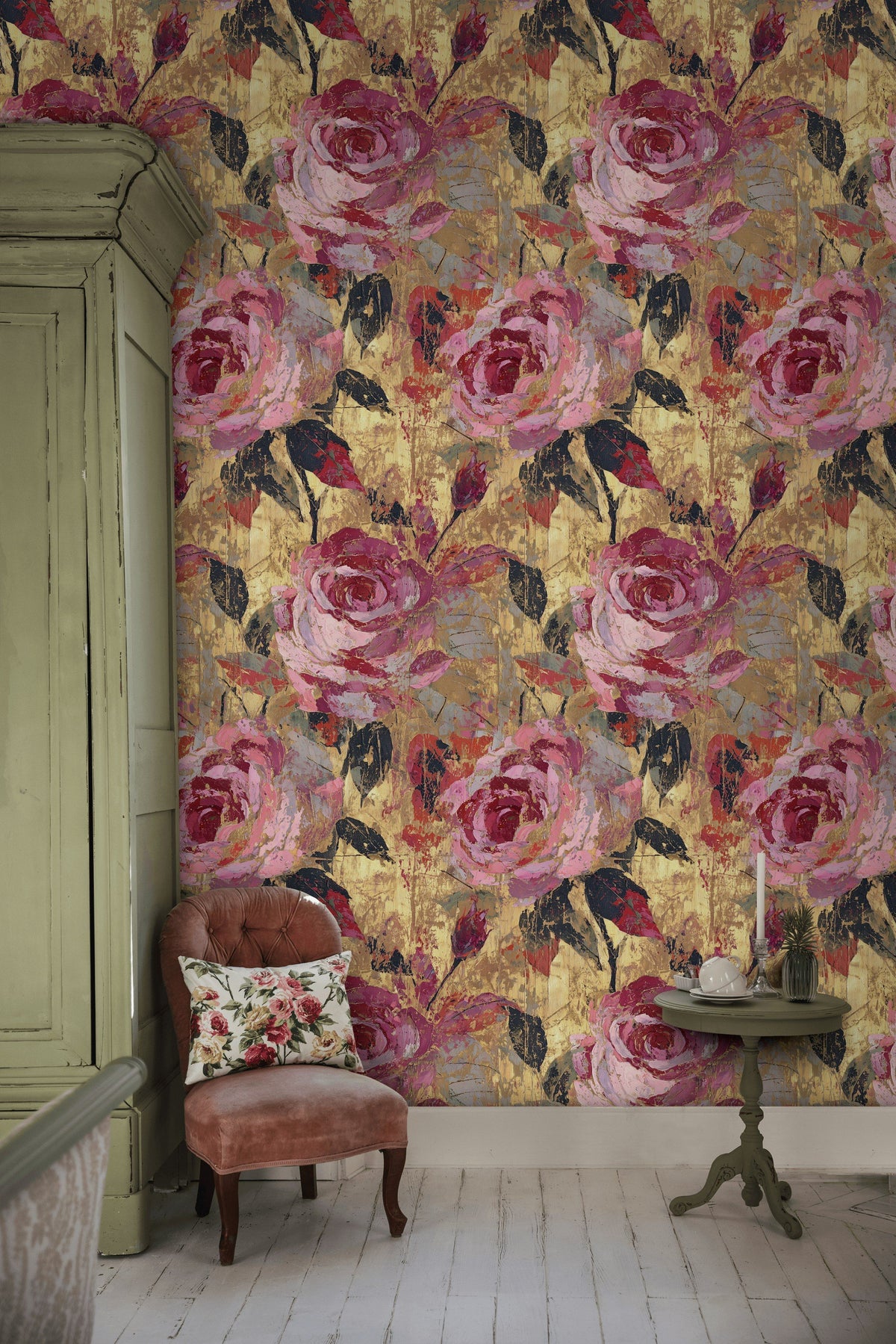 Opulent roses in rich pink hues are artistically brushstroked against a golden yellow background, creating an evocative vintage texture. The bold floral pattern offers a lush handcrafted aesthetic, reminiscent of classic oil paintings.Ideal for a living room or bedroom where a warm, nostalgic atmosphere is desired. Perfect for feature walls that need a statement-making floral impact.The wallpaper's textured finish provides a tactile depth, absorbing light in a way that adds a cozy, inviting aura