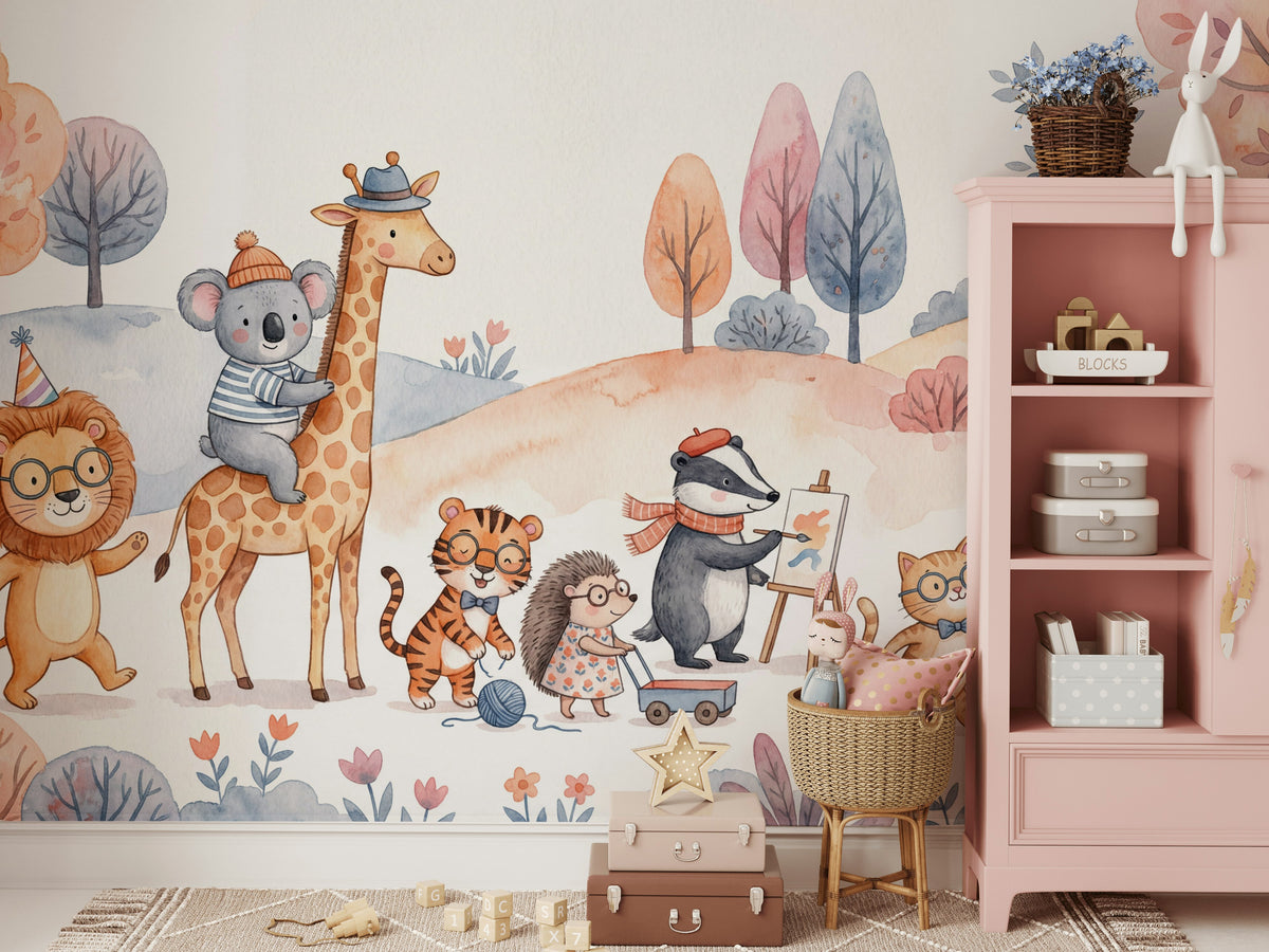 This playful mural shows animals painting in a whimsical scene with trees and balloons. The pastel colors and cartoon style work beautifully for a children's room.