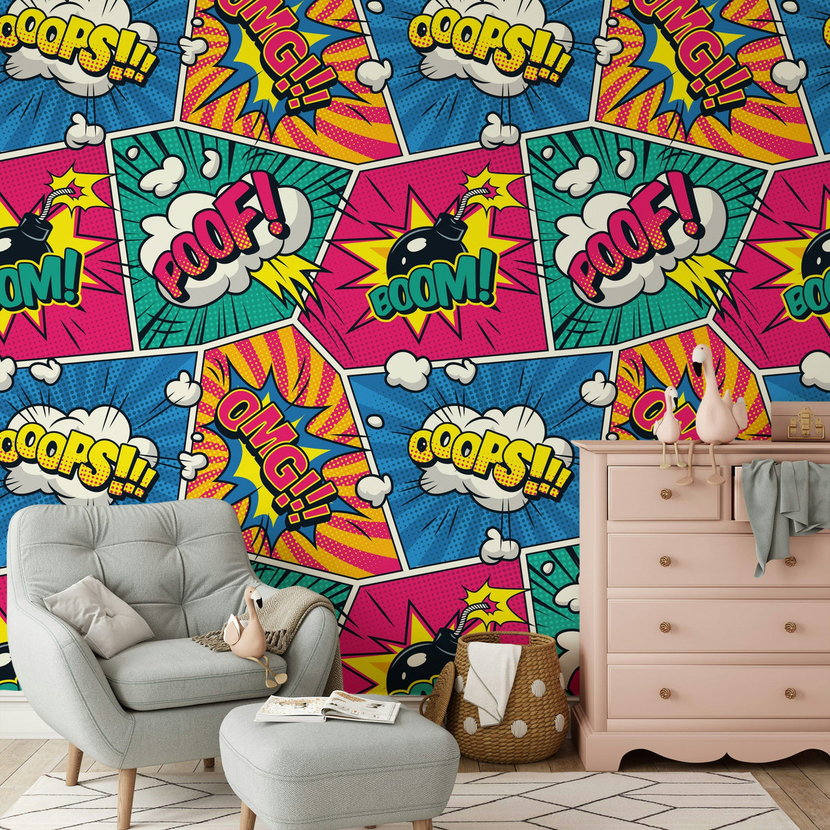 Bold comic book expressions burst across this vibrant pop art wallpaper, featuring dynamic colors like bright blue and pink. The large-scale pattern delivers a playful and energetic feel, perfect for creating a lively atmosphere in a kid's room or a teen's hangout space. The bright tones reflect light beautifully, adding a sense of fun and excitement to any space. Ideal for modern interiors, this wallpaper pairs well with colorful furniture and playful decor for a complete look.