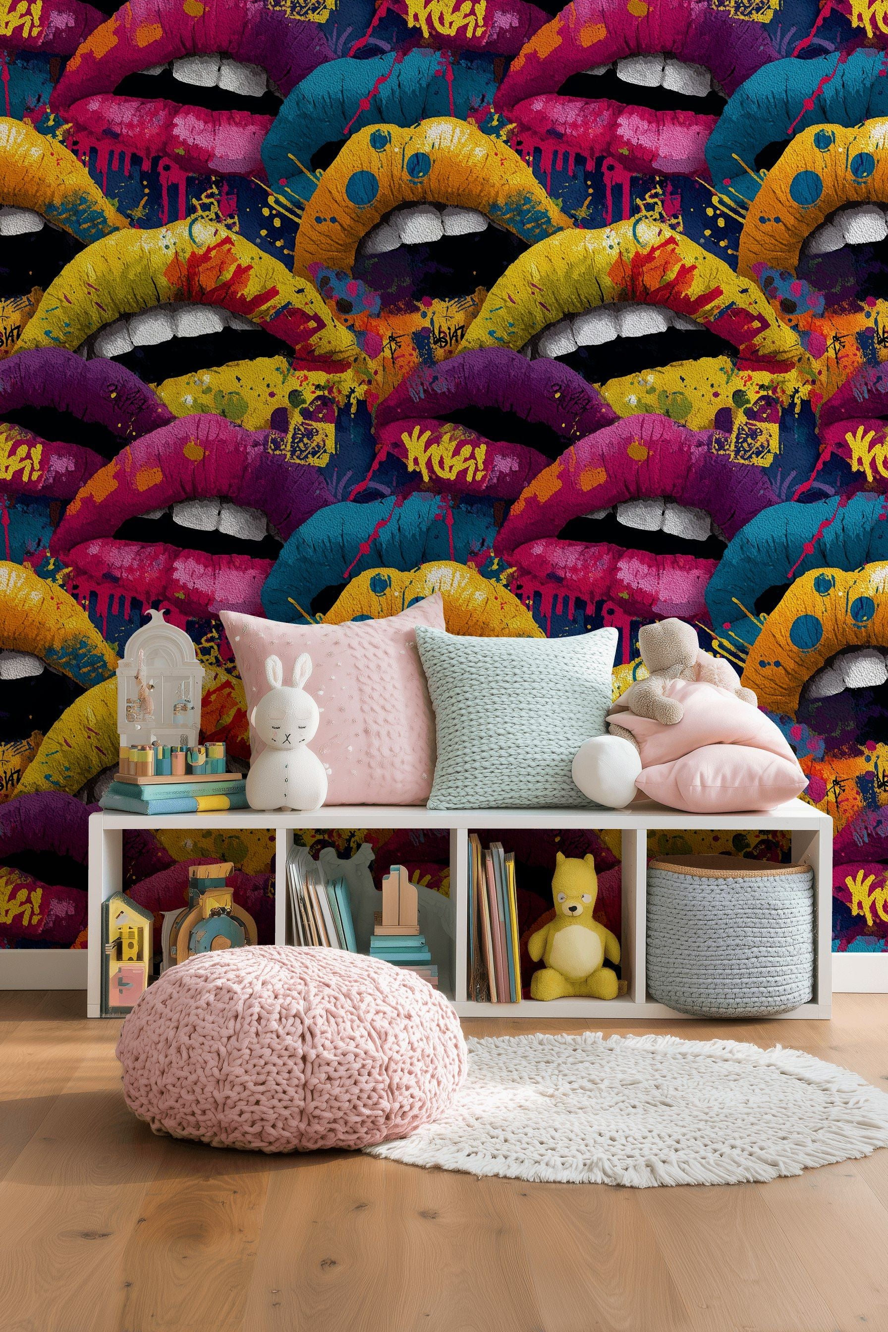 This pop art wallpaper showcases lips mural artwork with graffiti wall splashes in yellow, teal, and pink. Printed in a peel and stick format, it’s a bold pattern choice for accent wall projects, art decor studios, or urban style spaces. The colorful wall design and removable finish make it perfect for modern mural settings, while bright decor and mouth art details energize creative environments.