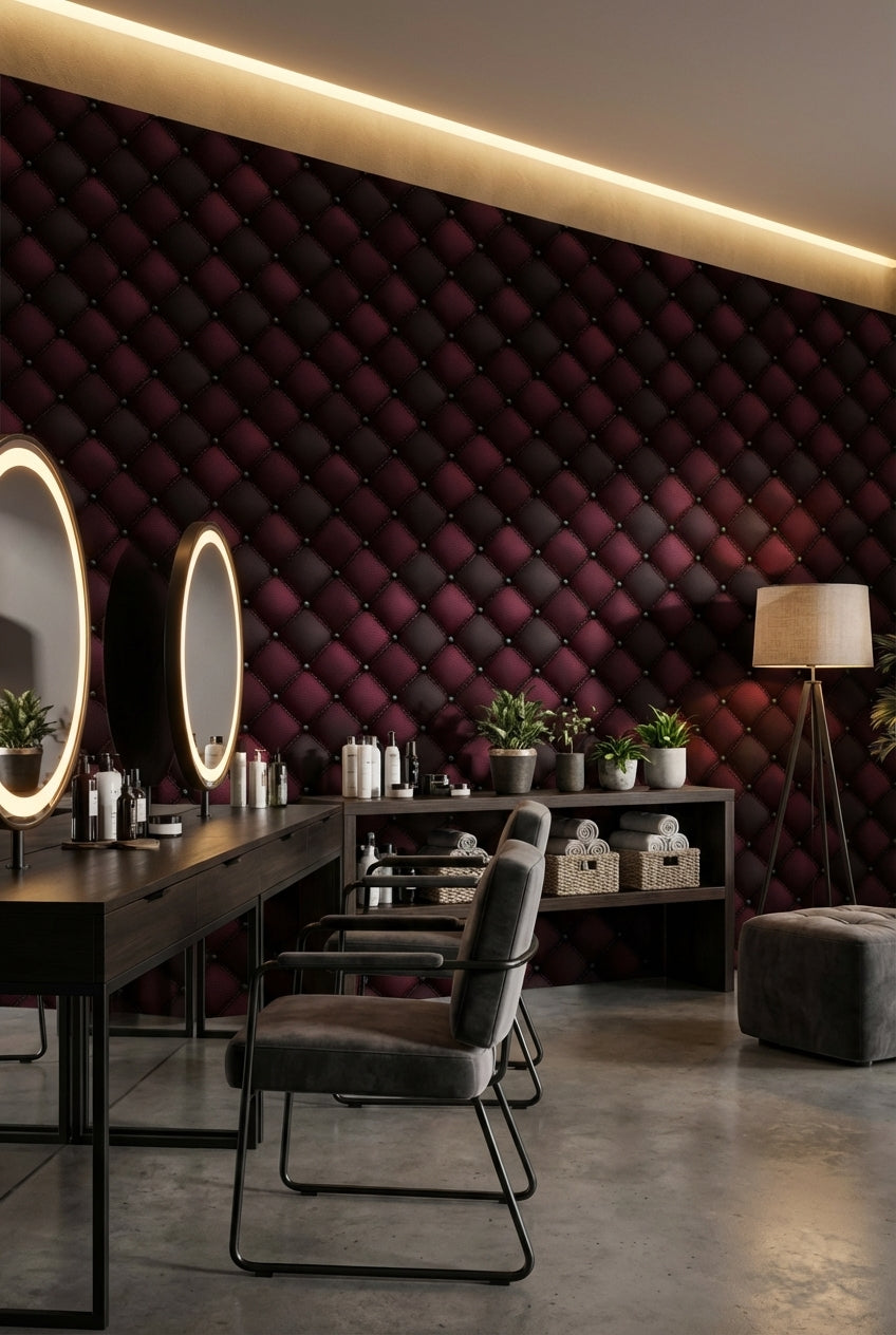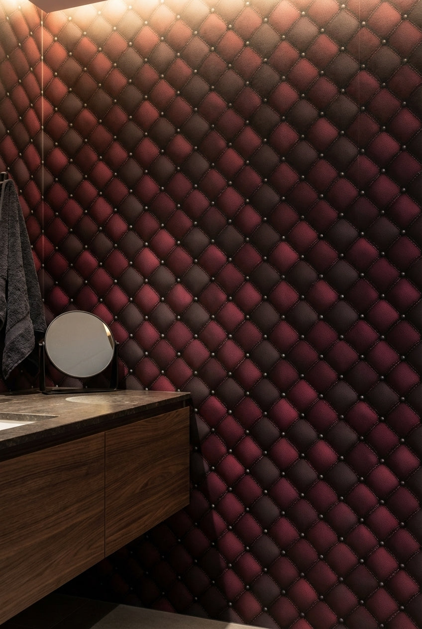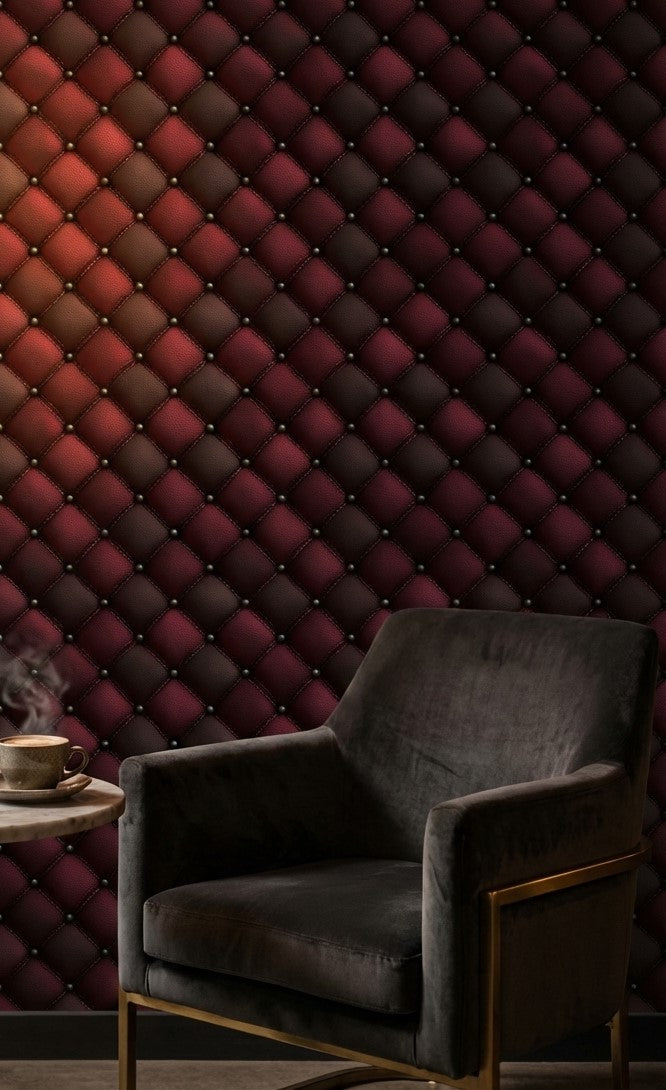 The bold pattern of the Dark Burgundy 3D Quilted Wallpaper is complemented by sleek metal accents, velvet furnishings, and dark-toned decor. These elements enhance the wallpaper’s luxurious feel, creating a cohesive and elegant design theme.