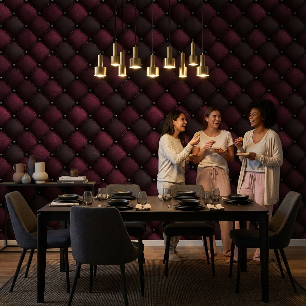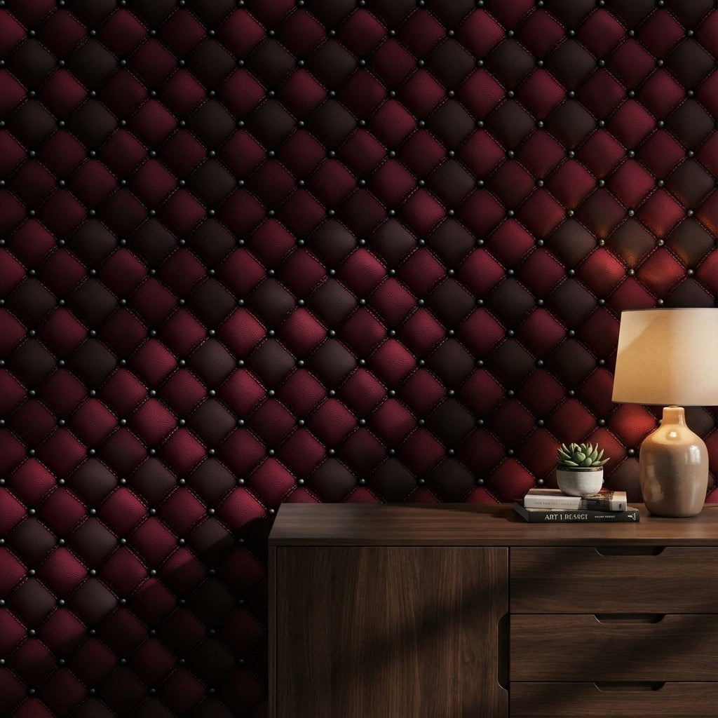 A rich dark burgundy wallpaper featuring a striking 3D quilted pattern that mimics plush upholstery. The illusion of depth and texture provides a luxurious feel, making it a unique addition to contemporary settings. Perfect for modern living rooms or bedrooms, this wallpaper adds a touch of sophistication and elegance. The deep colors and bold pattern create a dramatic atmosphere, ideal for spaces seeking a moody, upscale ambiance. Pairs well with sleek metal accents, velvet furnishings, and dar