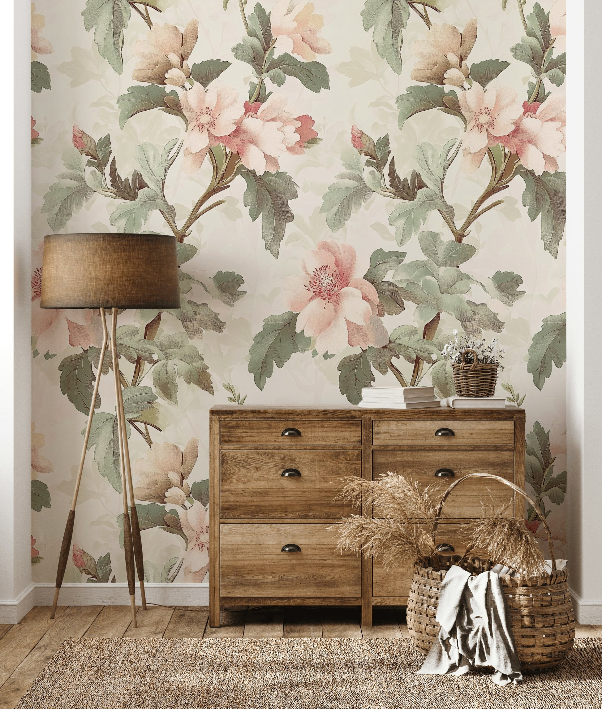 Bring the gentle beauty of a spring garden into your home with this romantic floral wallpaper. Featuring delicate blush pink blooms and sage green foliage on a cream background, this design creates a soft, feminine atmosphere with its vintage botanical style. The subtle watercolor effect adds an artistic touch that brings sophistication to any space.