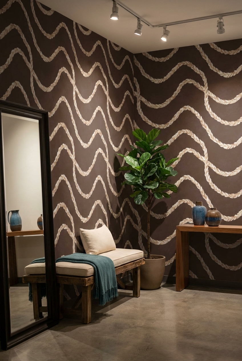 Rich dark chocolate brown serves as the backdrop for large braided rope patterns that wind across the surface, creating a captivating abstract effect. The bold design adds texture and depth, making it an eye-catching focal point for any room.Ideal for modern living rooms or home office spaces, this wallpaper brings a sense of warmth and sophistication. The dark tones anchor the atmosphere, making it perfect for rooms with ample lighting.The intricate rope detailing provides a textured effect, ad