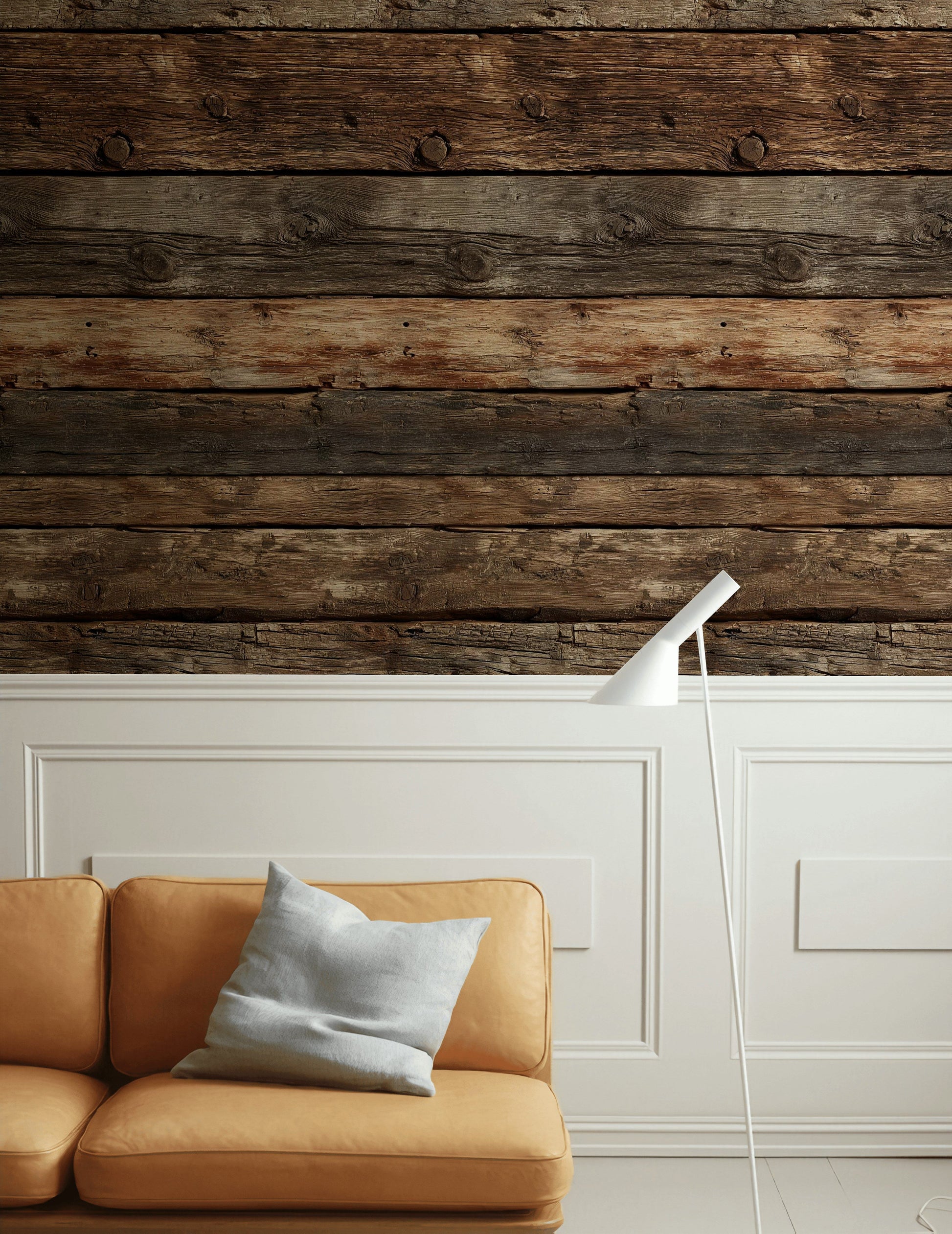 This rustic wood wallpaper is designed with detailed timbertexture and weatheredwall planks that capture the charm of reclaimedwood. Featuring rich brownwallpaper hues and naturaltexture details, it brings an authentic barnwood aesthetic to cabinstyle or farmhousewall spaces. The pattern includes visible knots and agedwood grain, perfect for rusticdecor interiors.