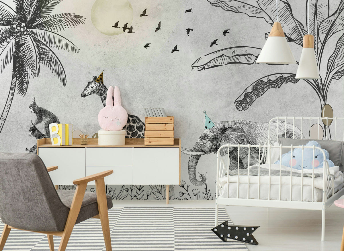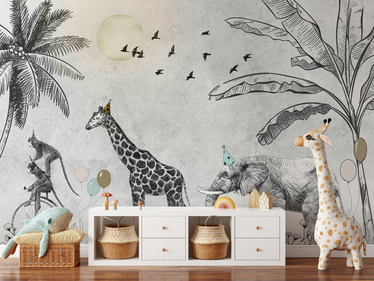 This wall mural features a whimsical safari scene with sketch-style giraffes and elephants wearing party hats, surrounded by tropical plants and distant birds. The predominantly grey and beige tones create a soft and playful atmosphere, suitable for kids' bedrooms and playrooms.