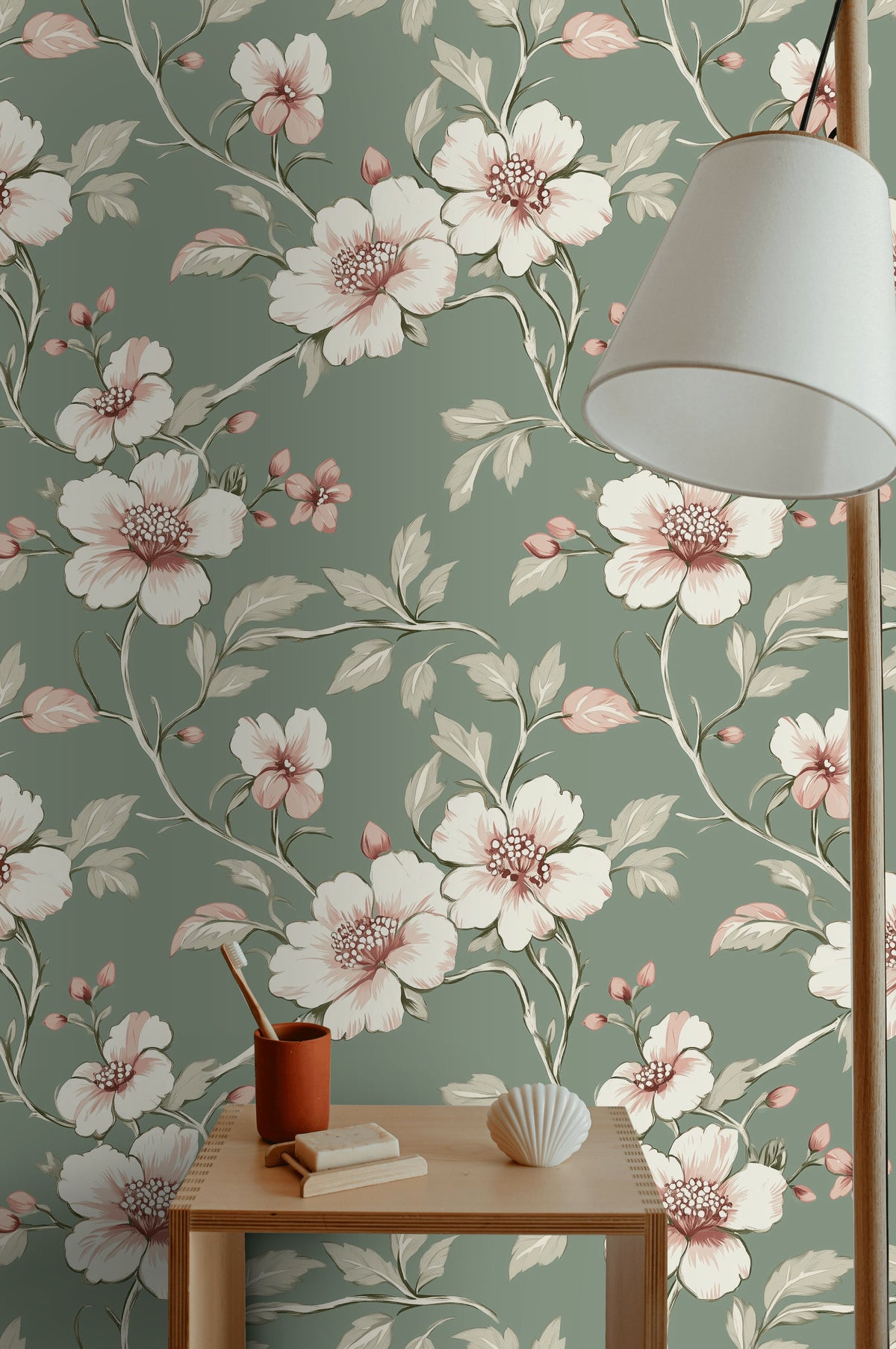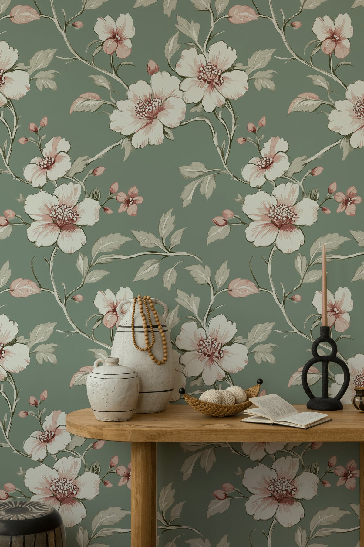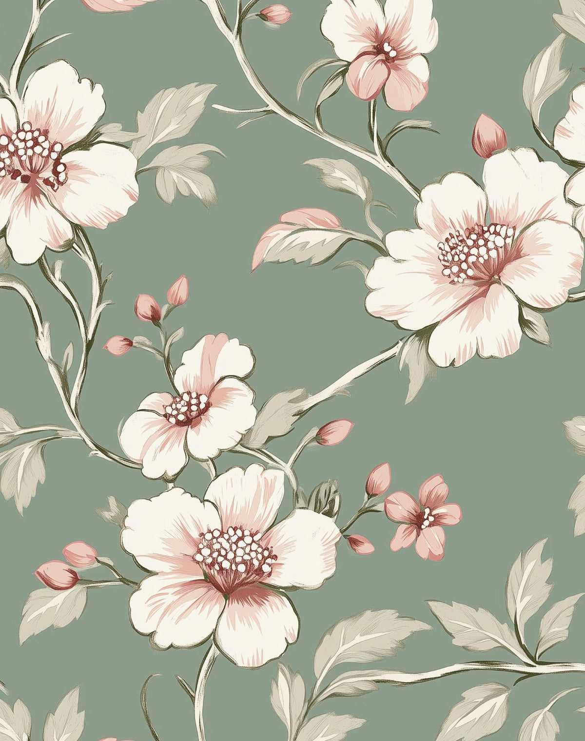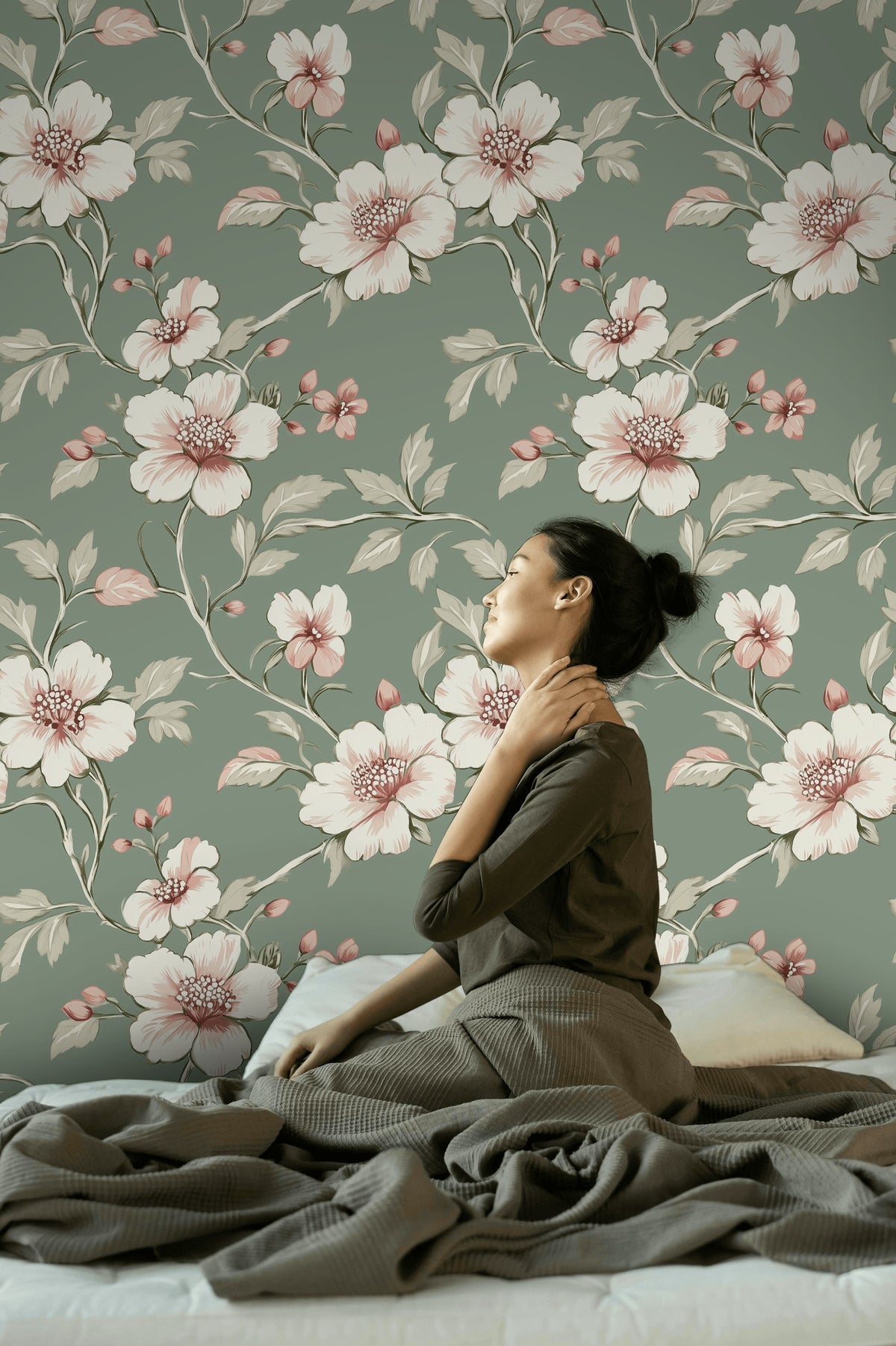 Delicate cherry blossoms in soft pinks cascade across a sage green background, creating a serene floral design with a modern botanical feel. The large-scale blossoms and subtle leaf patterns bring a fresh elegance to walls. Suitable for bedrooms and living rooms, this wallpaper offers a gentle focal point while enhancing tranquility. The soft light reflection adds warmth and depth, offering a comforting ambiance. This design pairs beautifully with modern interiors, featuring neutral or pastel furnishings, natural wood, and soft textiles.