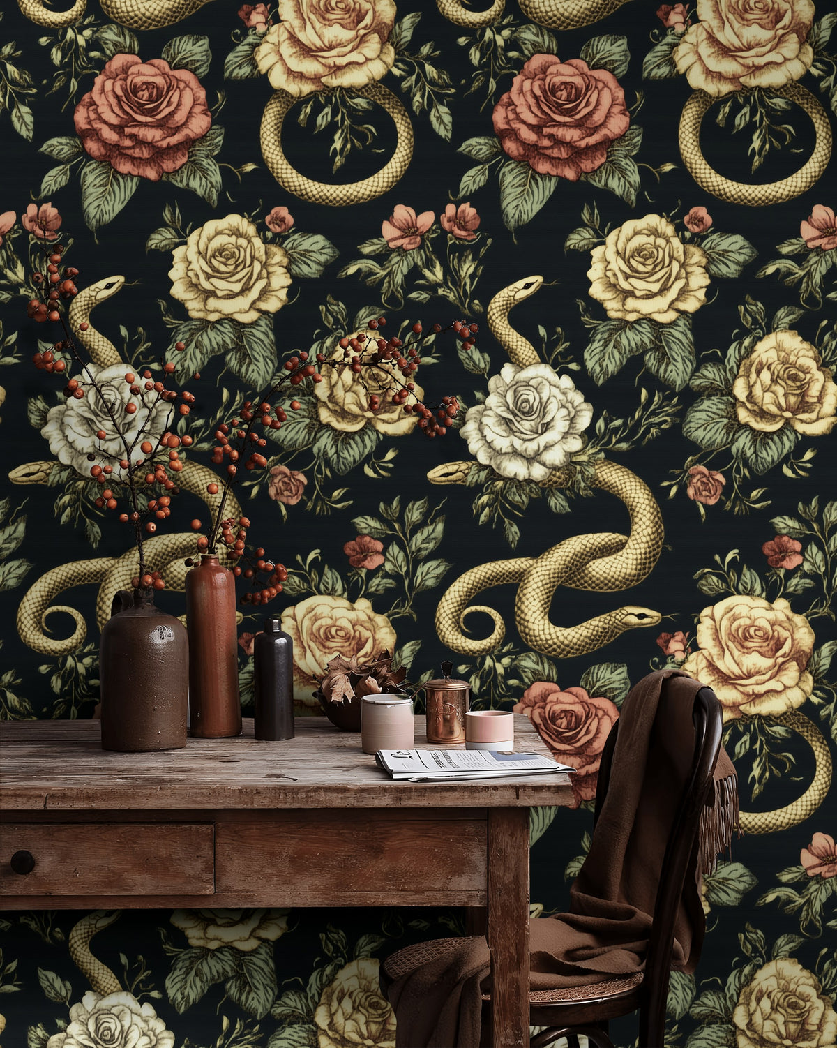 What makes the rose and snake motifs in this wallpaper unique?