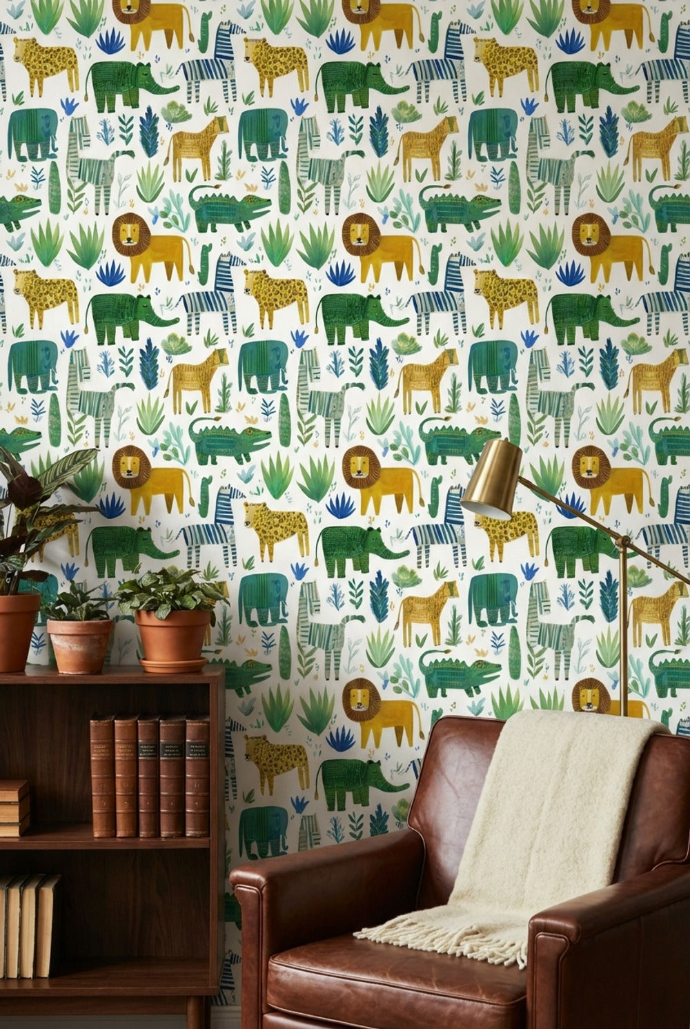 This playful wallpaper features cheerful animals and vibrant plants. The design includes shades of green, blue, and orange, perfect for creating a lively and child-friendly environment.