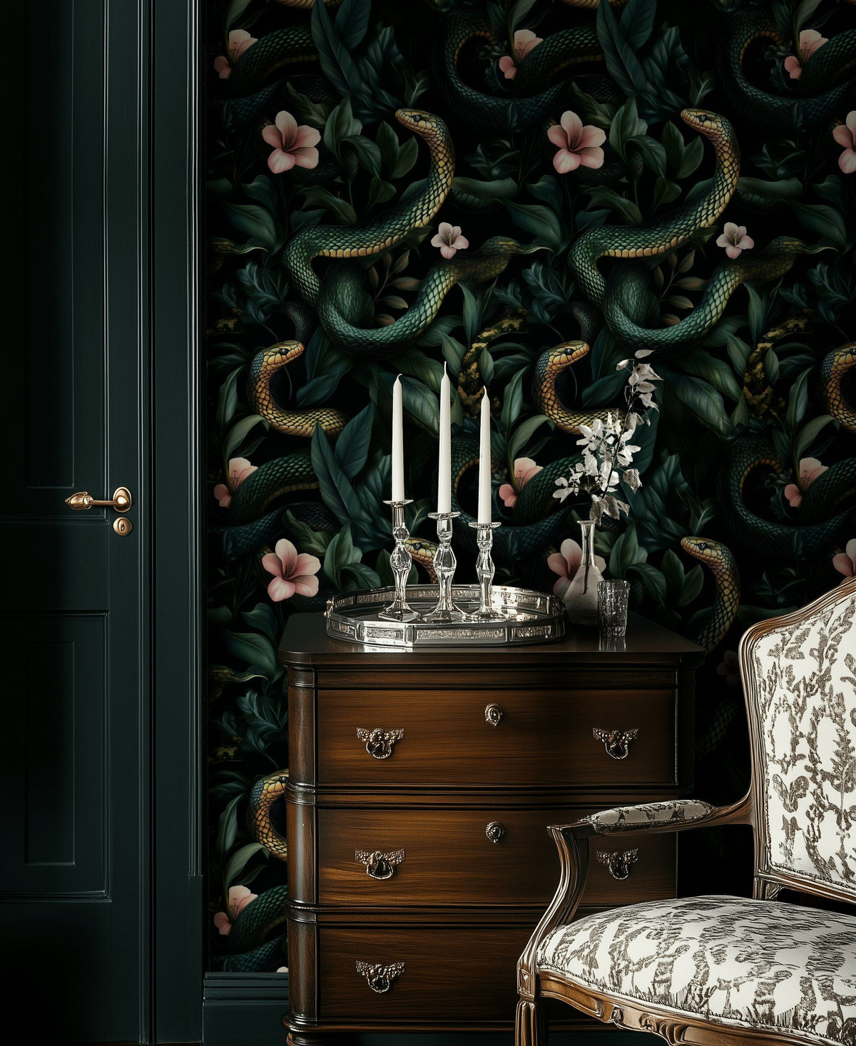 Is the Dark Jungle Snake and Blossom Wallpaper suitable for a bedroom setting?