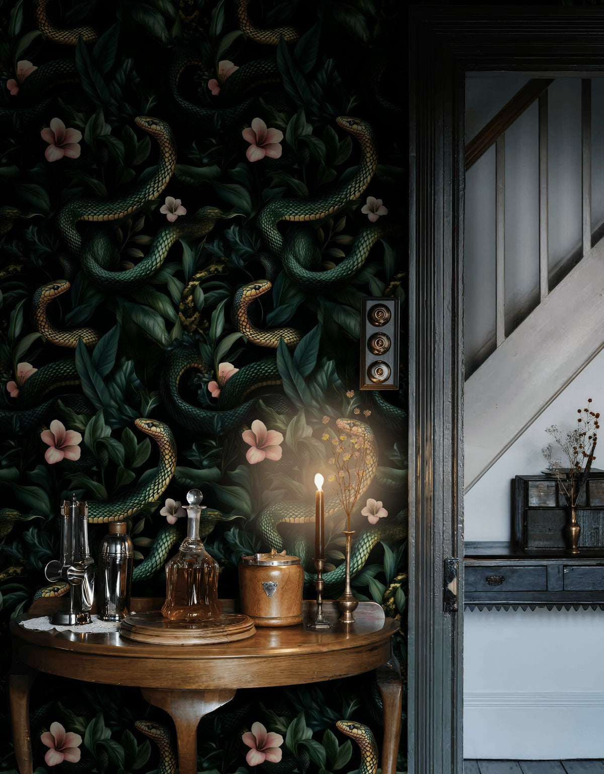 Warm, ambient lighting is ideal for highlighting the intricate details of the Dark Jungle Snake and Blossom Wallpaper. Using strategically placed lamps or dimmable overhead lighting can enhance the dark tones and bring out the vibrancy of the green and pink elements.