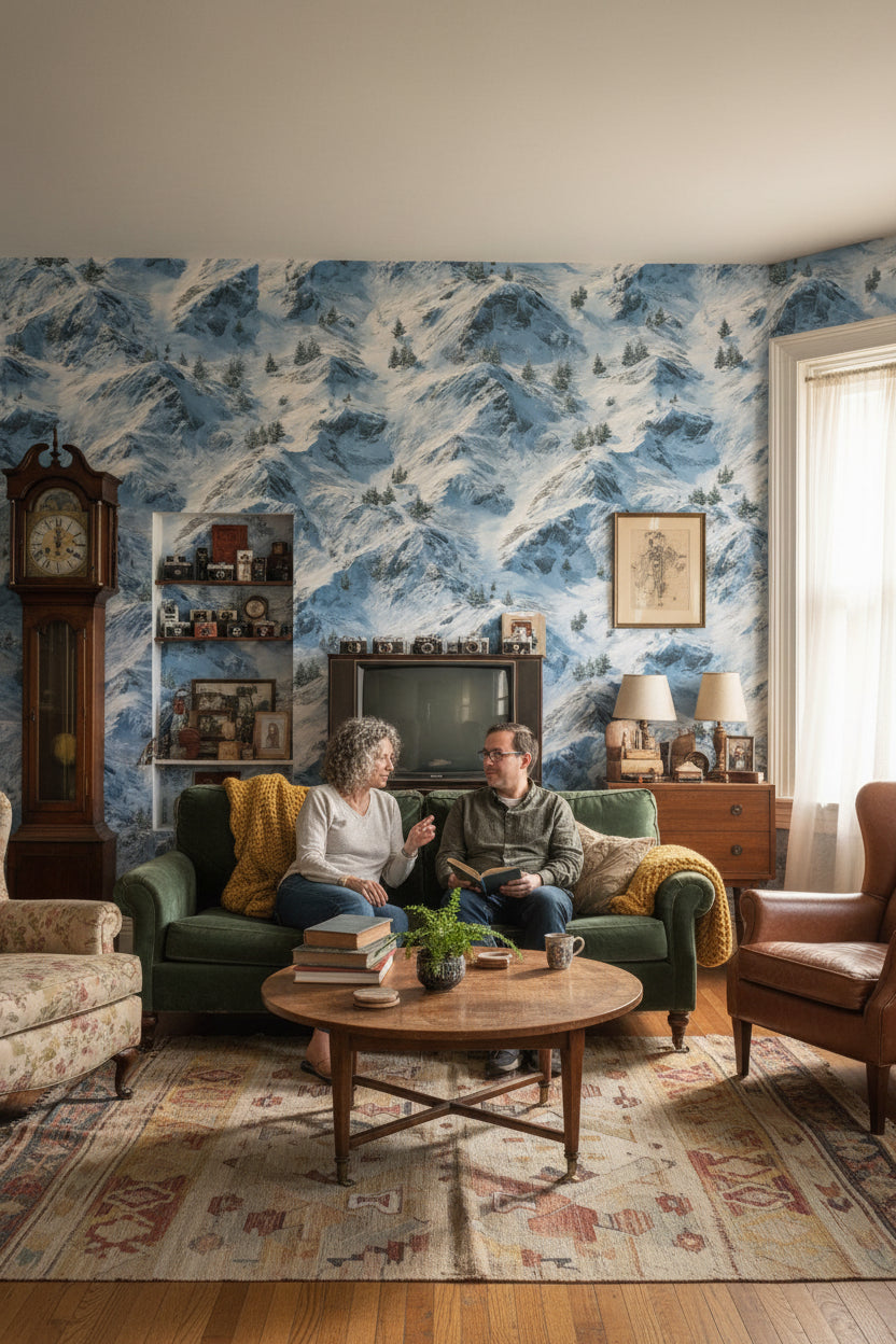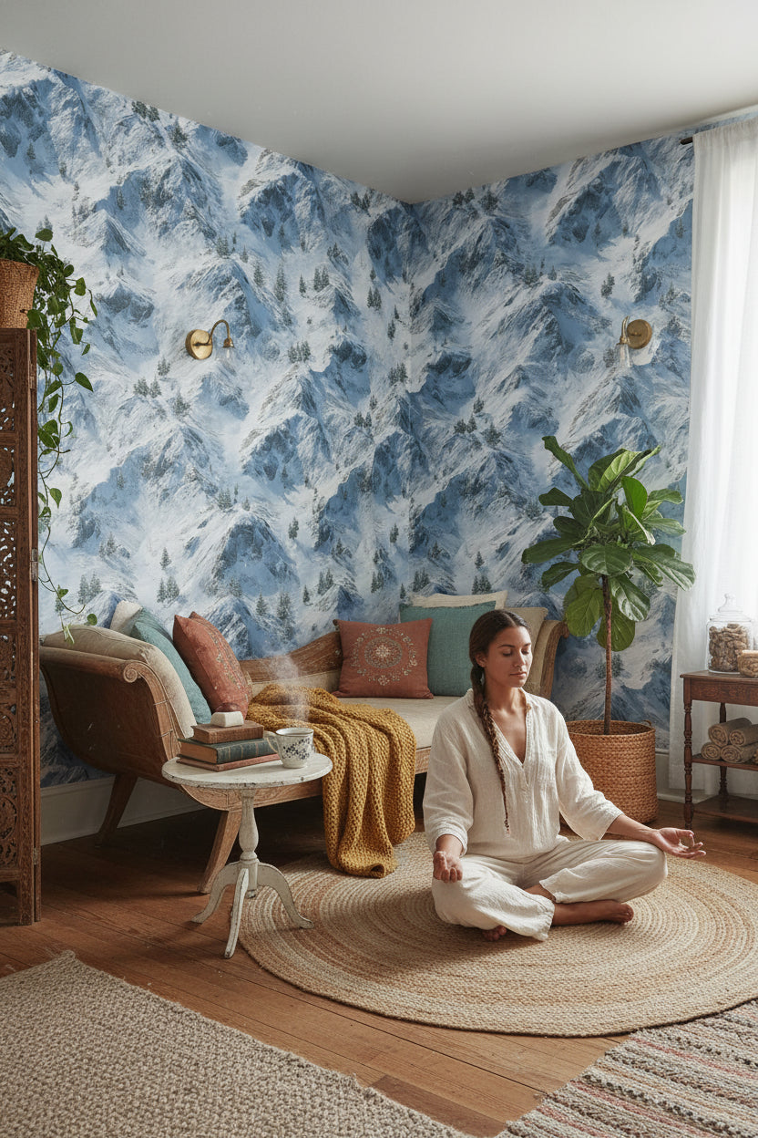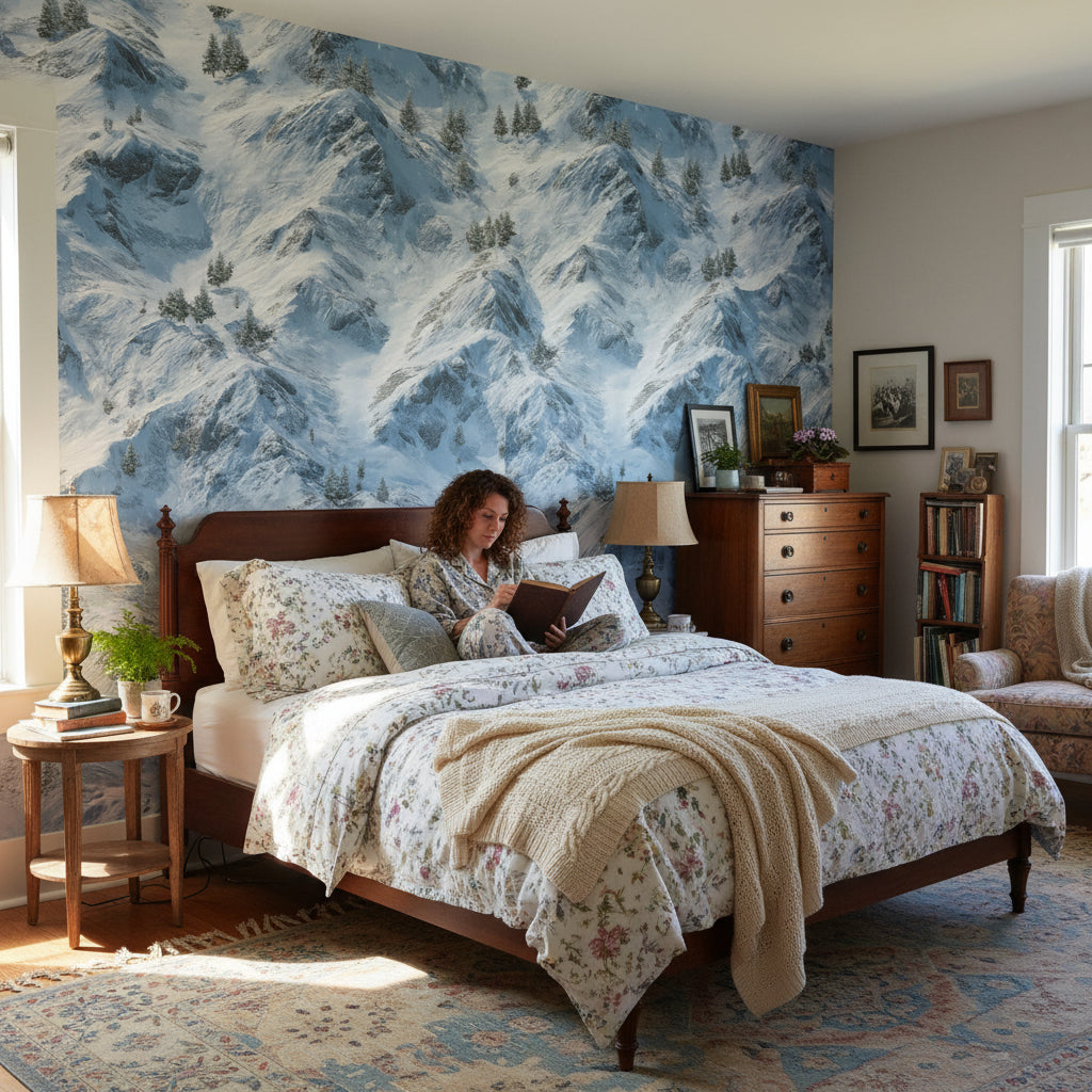 This mural shows snow-covered mountains with white and blue hues, offering a serene landscape. The natural scenery includes trees against a peaceful winter backdrop, ideal for nature-inspired decor.