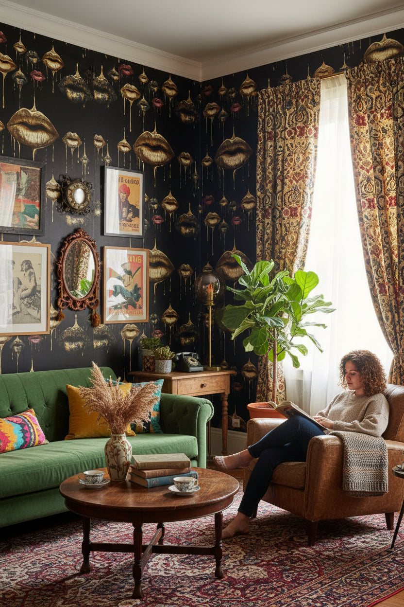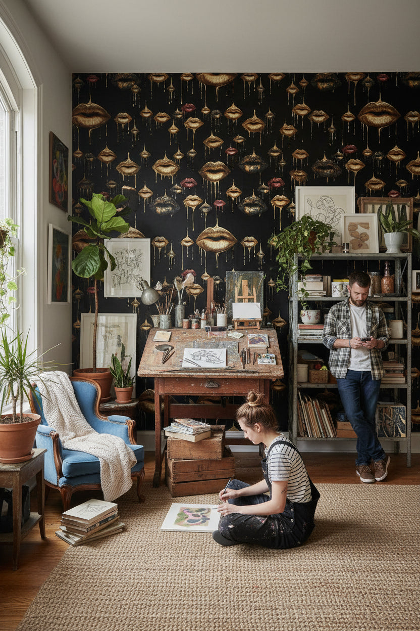This wallpaper has an elegant design with melting paint effects in black, gold, and red. The modern style works beautifully as a striking decor piece.