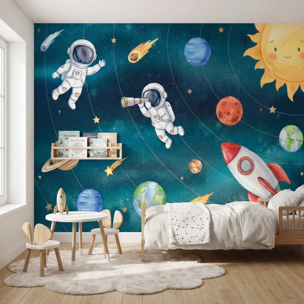 This playful mural features astronauts and rockets navigating through colorful planets and stars. The vibrant blue, yellow, and red tones create a whimsical space adventure perfect for children's decor.