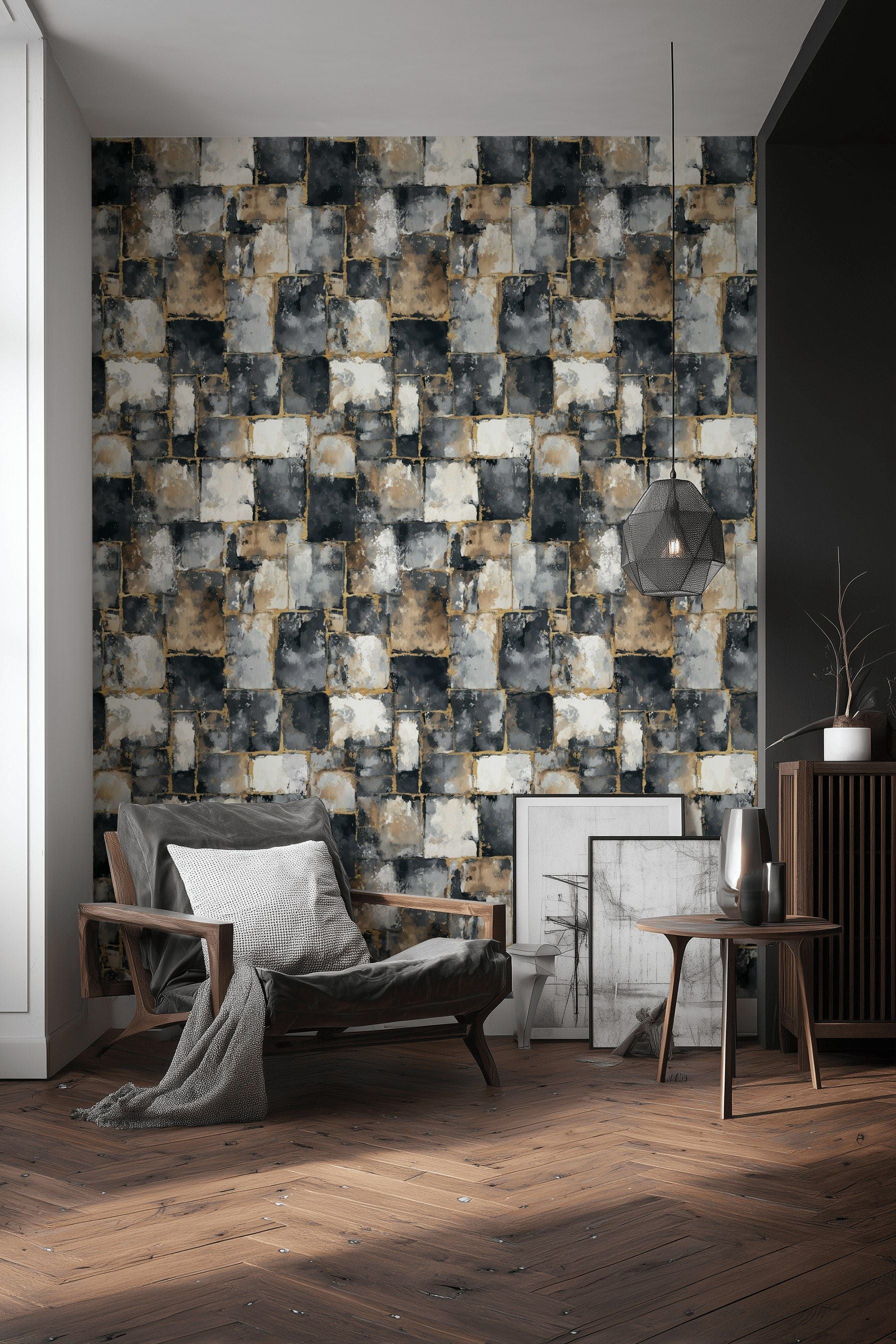This stone wallpaper creates a striking effect with block mural patterns and gold accent details across textured charcoal and beige tones. The peel and stick application offers a removable solution for accent wall projects, blending faux stone visuals with a stacked pattern. Designed for modern wall decor and industrial spaces, the bold abstract stone look adds depth to any interior, with hints of white and neutral shades woven throughout.
